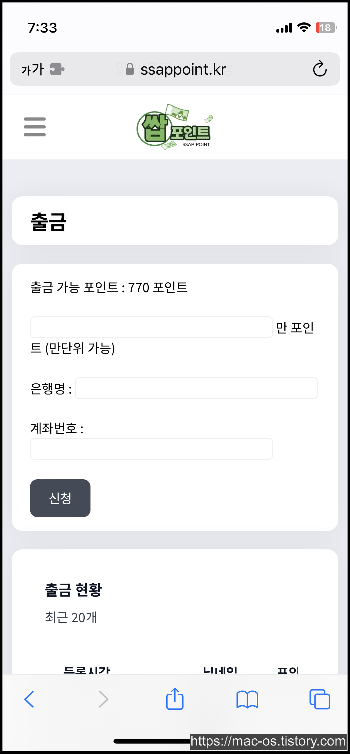 왼쪽 사진을 보면 포인트가 740점에서 770점으로 변경된 것을 확인할 수 있다. 그리고 출금신청을 누르면 출금 페이지로 이동하게 되는데, 5천 포인트부터 출금이 가능하다고 한다.