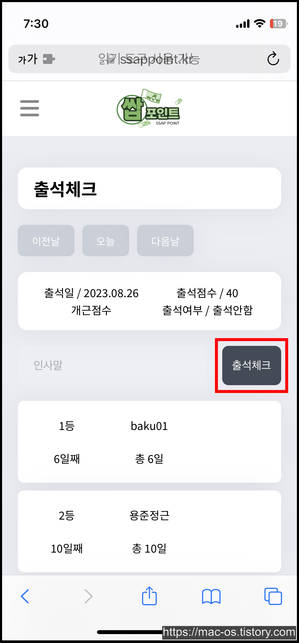 출석체크 페이지에서 출석체크 버튼을 누르면 40포인트가 적립된다.