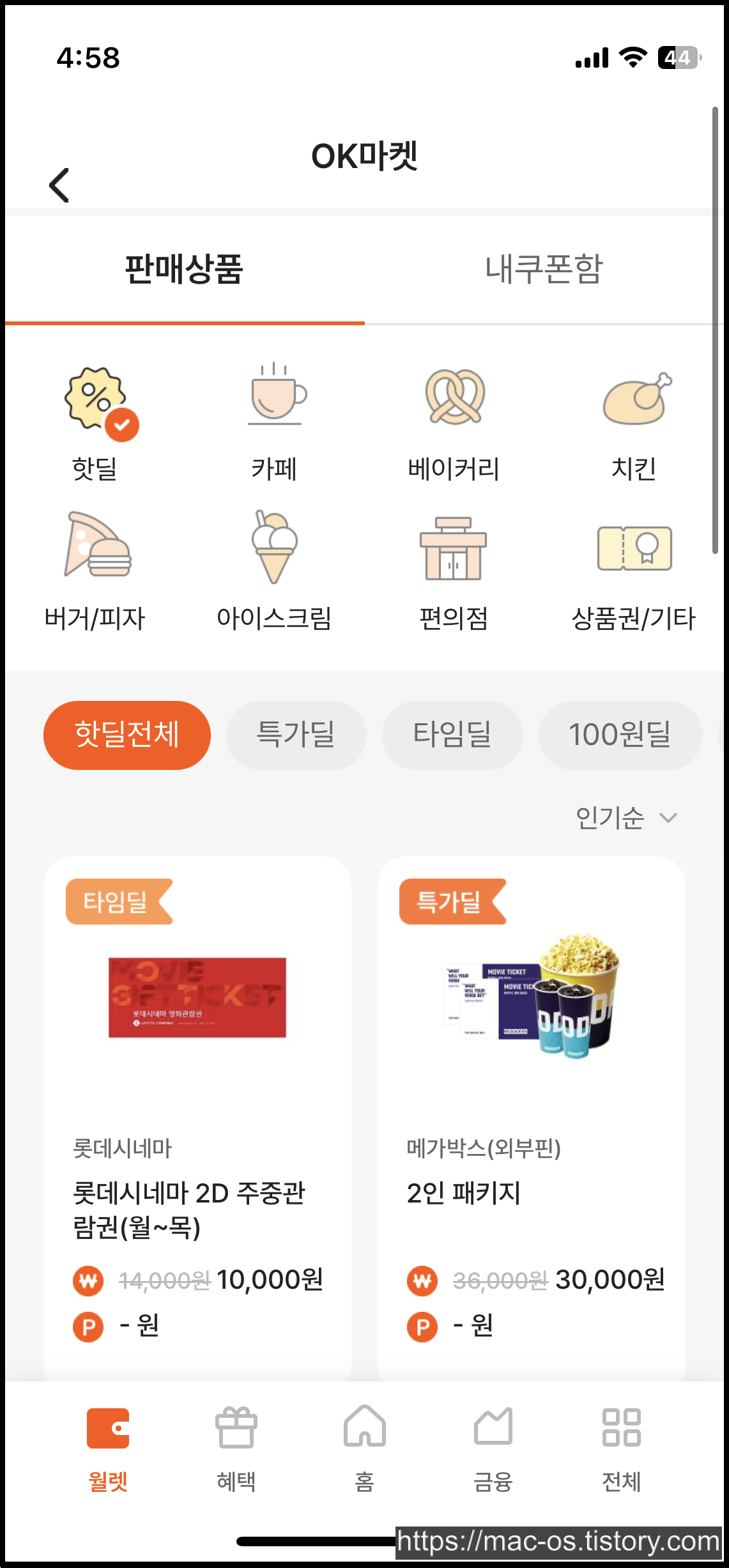 OK마켓 핫딜은 직접 돈을 내고 구매해야 하지만, 그 외에는 OK포인트를 사용하여 구매할 수도 있다.