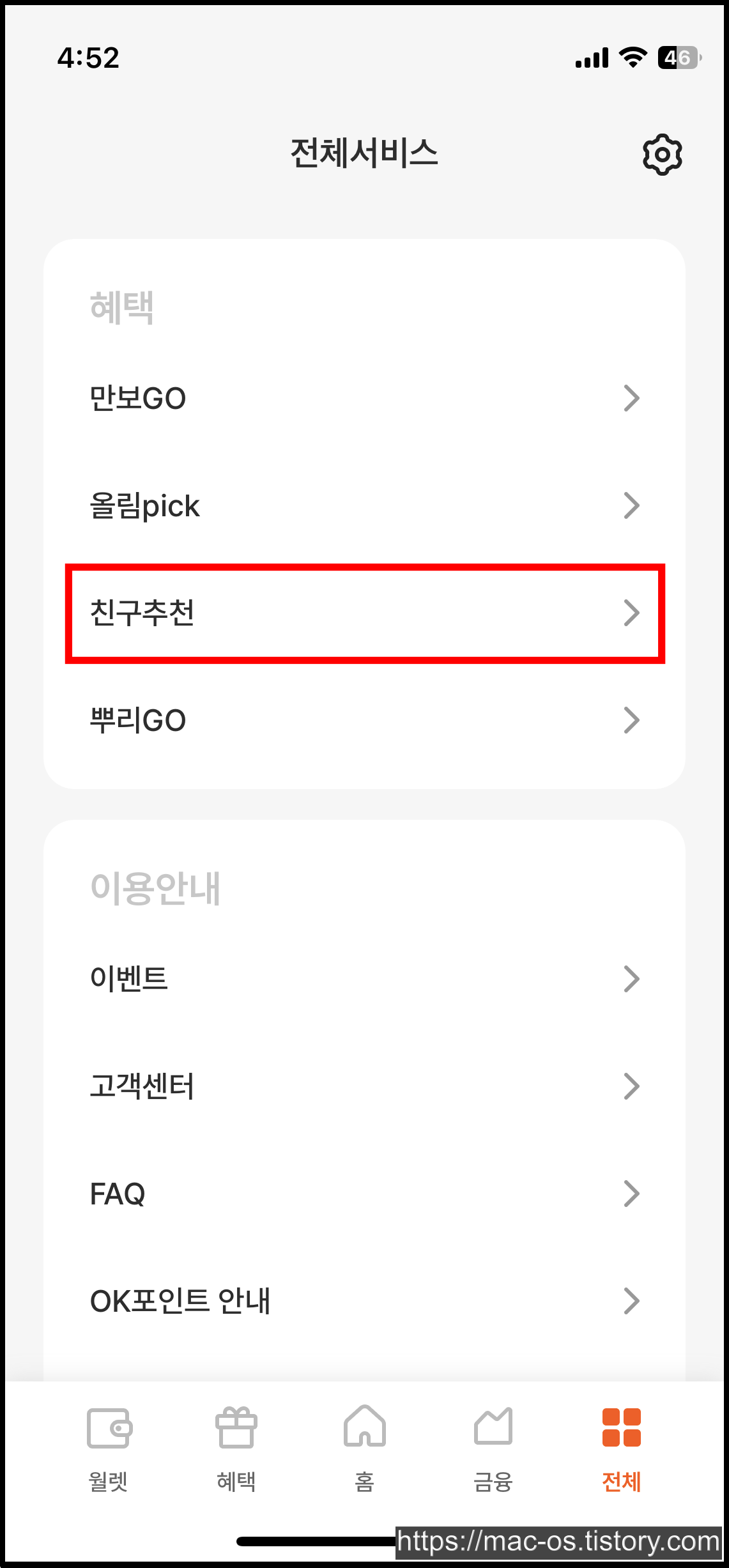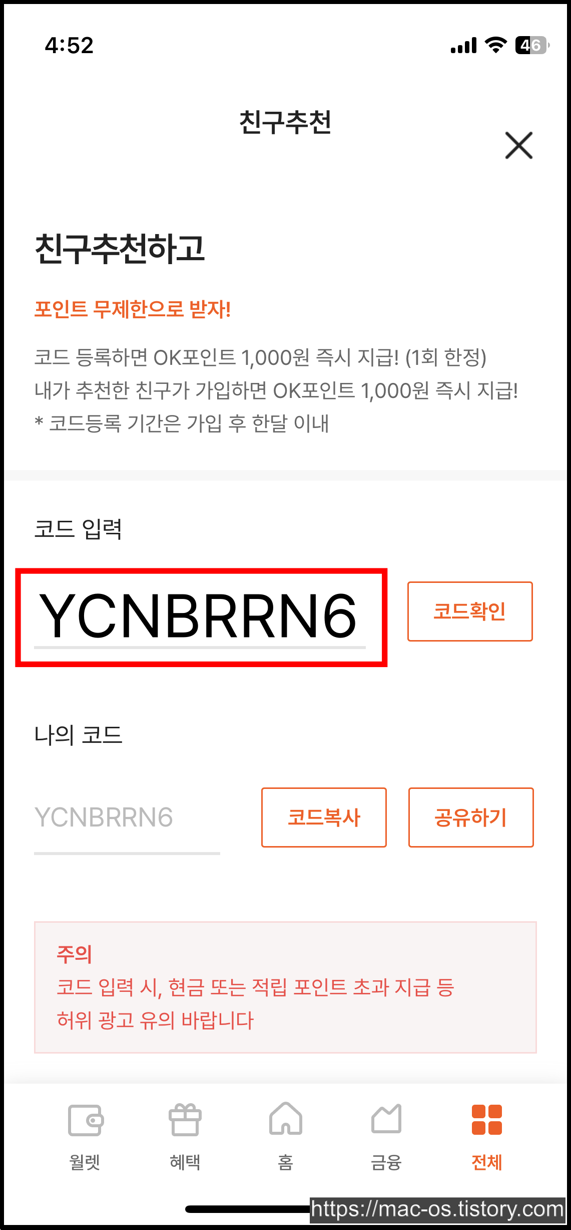 회원가입을 하고 나서 [전체] → [친구추천]으로 이동하면 추천인 코드를 입력할 수 있다. 추천인 코드를 입력하게 되면 신규 회원은 1,000원을 즉시 받을 수 있으니 입력하는 것이 좋다.