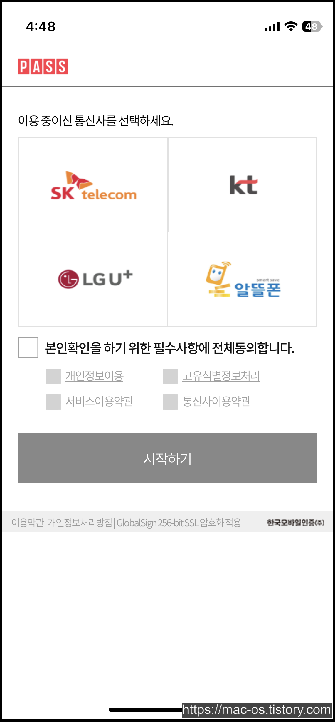 이용약관 동의를 하고 본인확인 버튼을 누른다.
