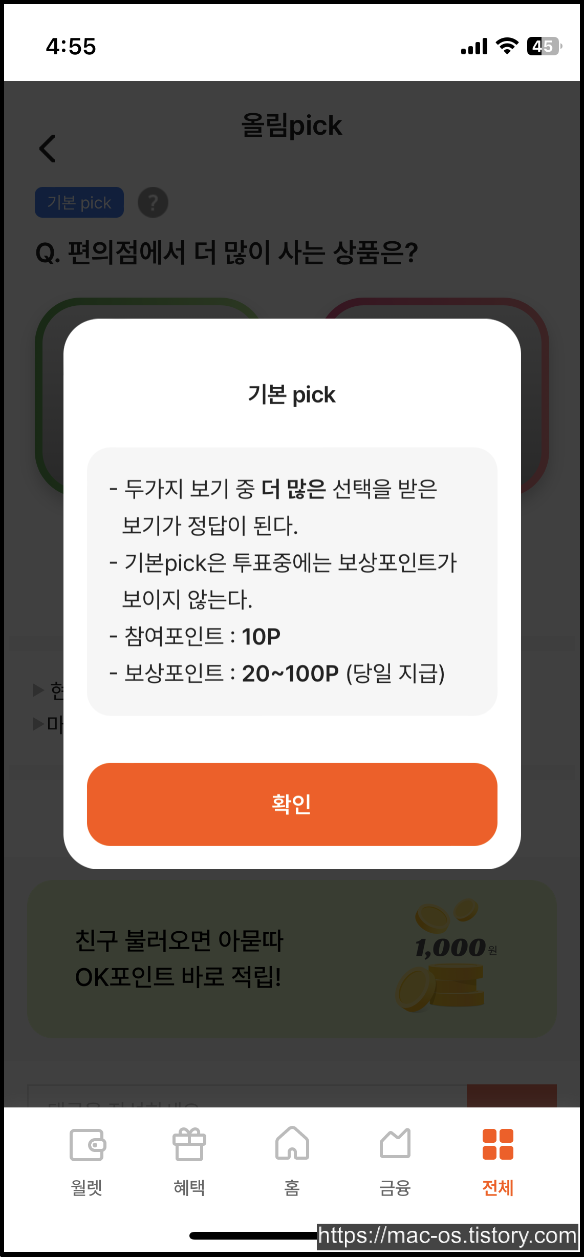 올림pick에서는 여러 퀴즈가 있는데, 퀴즈를 맞추면 보상으로 포인트가 지급되는 식이다.