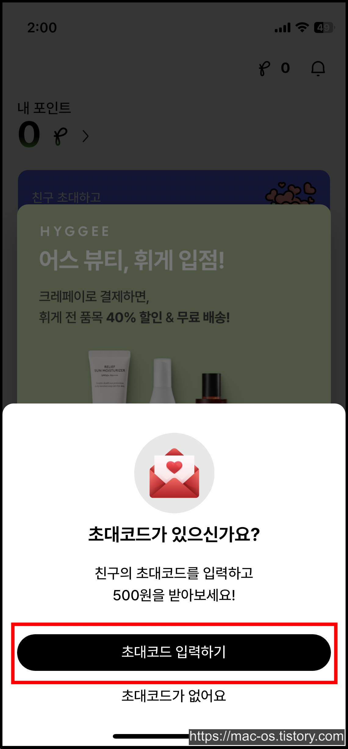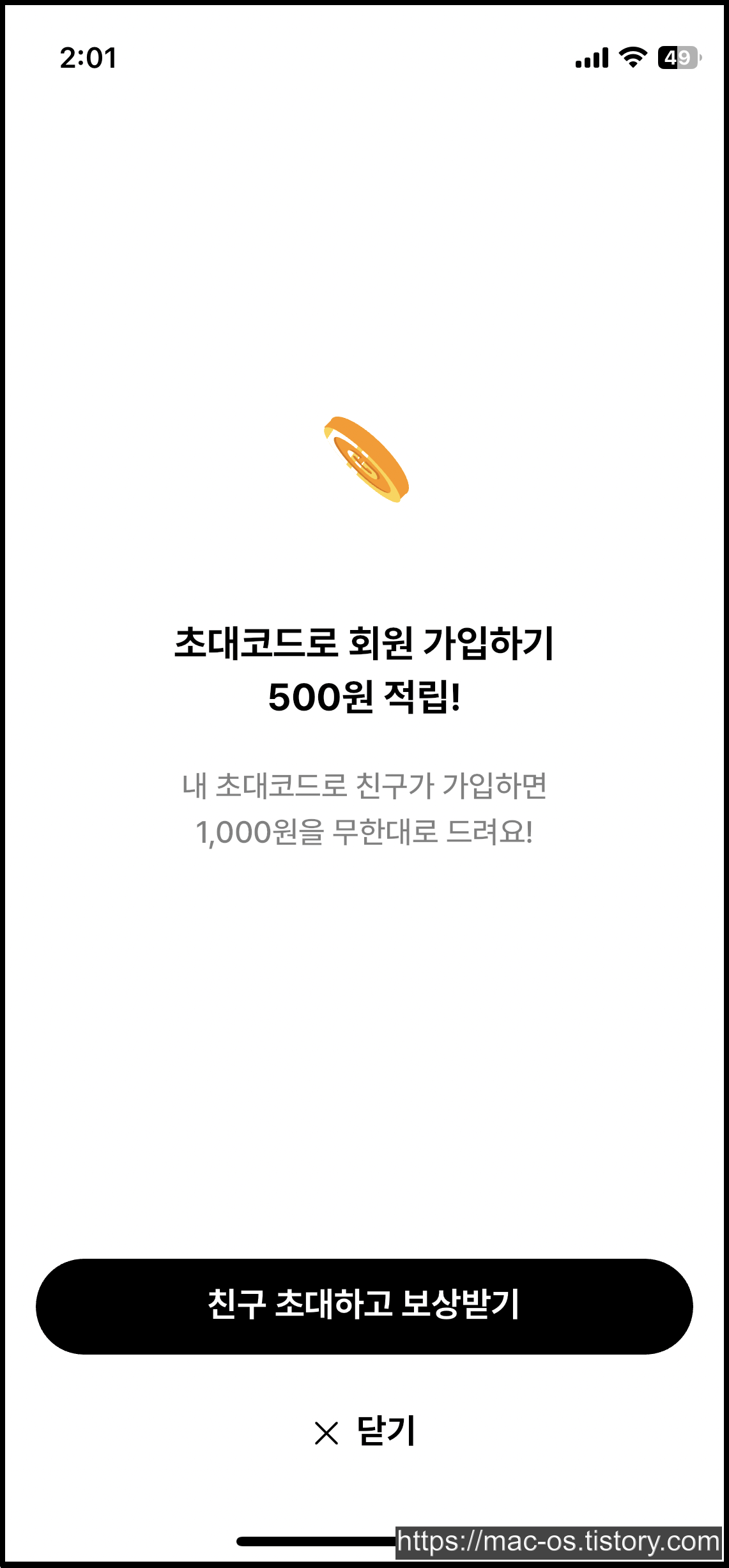 회원가입을 하고 나면 왼쪽 사진처럼 초대코드가 있냐고 물어보는데, 초대코드를 입력하면 500원을 주기 때문에 입력하는 것이 좋다.
