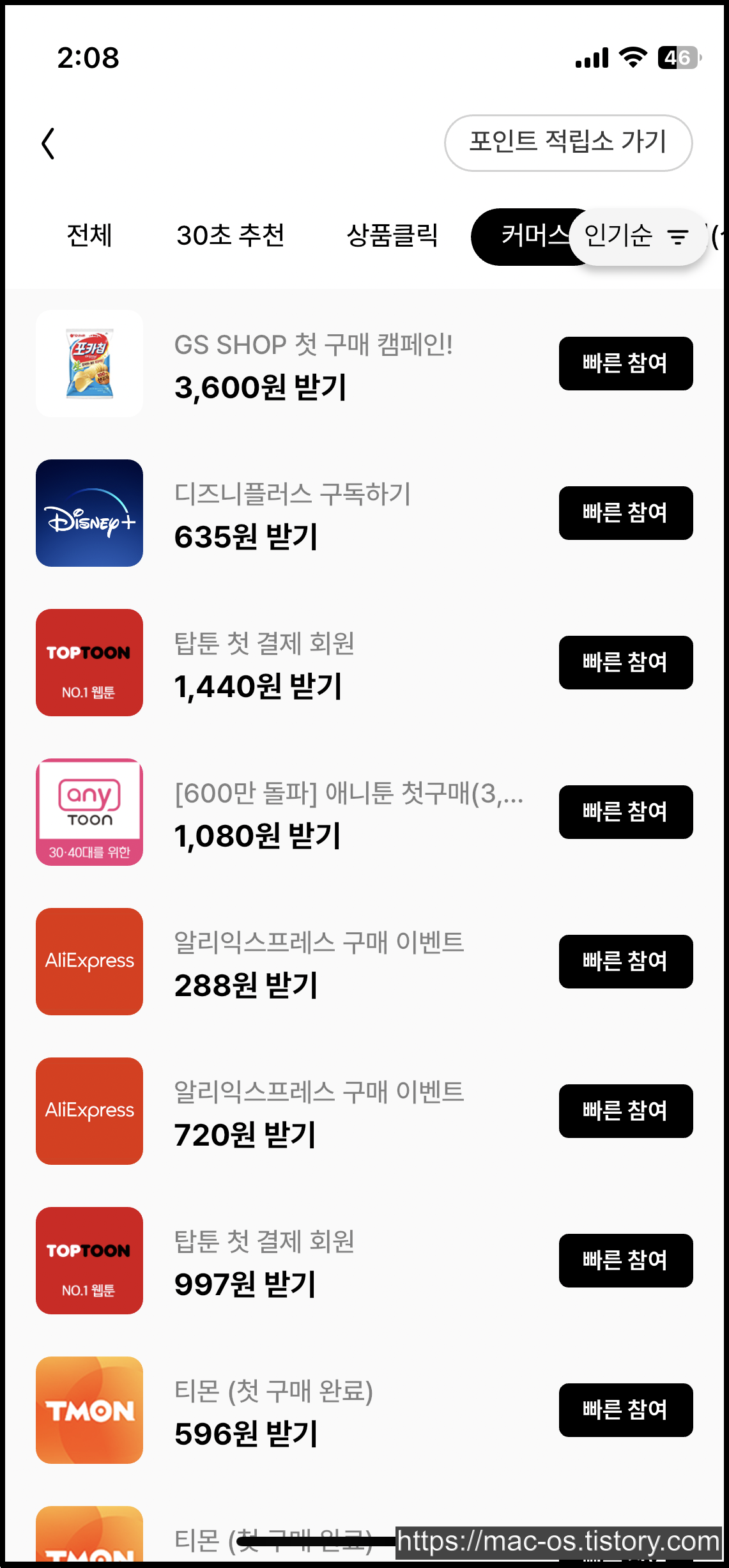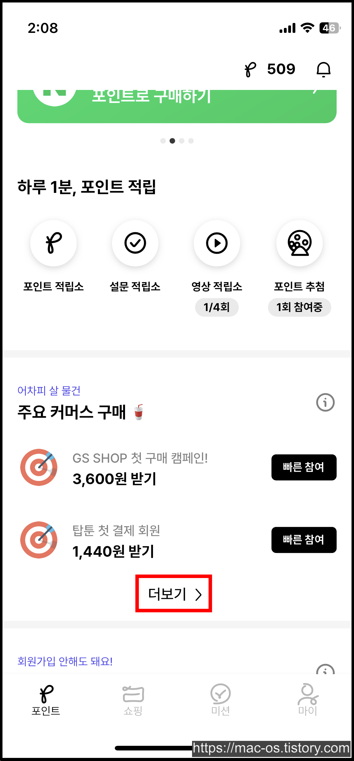 포인트 탭에서 [더보기]를 누르면 30초 추천, 상품클릭, 커머스 구매 등 여러 광고가 나타나는데, 광고가 생각보다 많아서 상당히 괜찮다고 느꼈다.