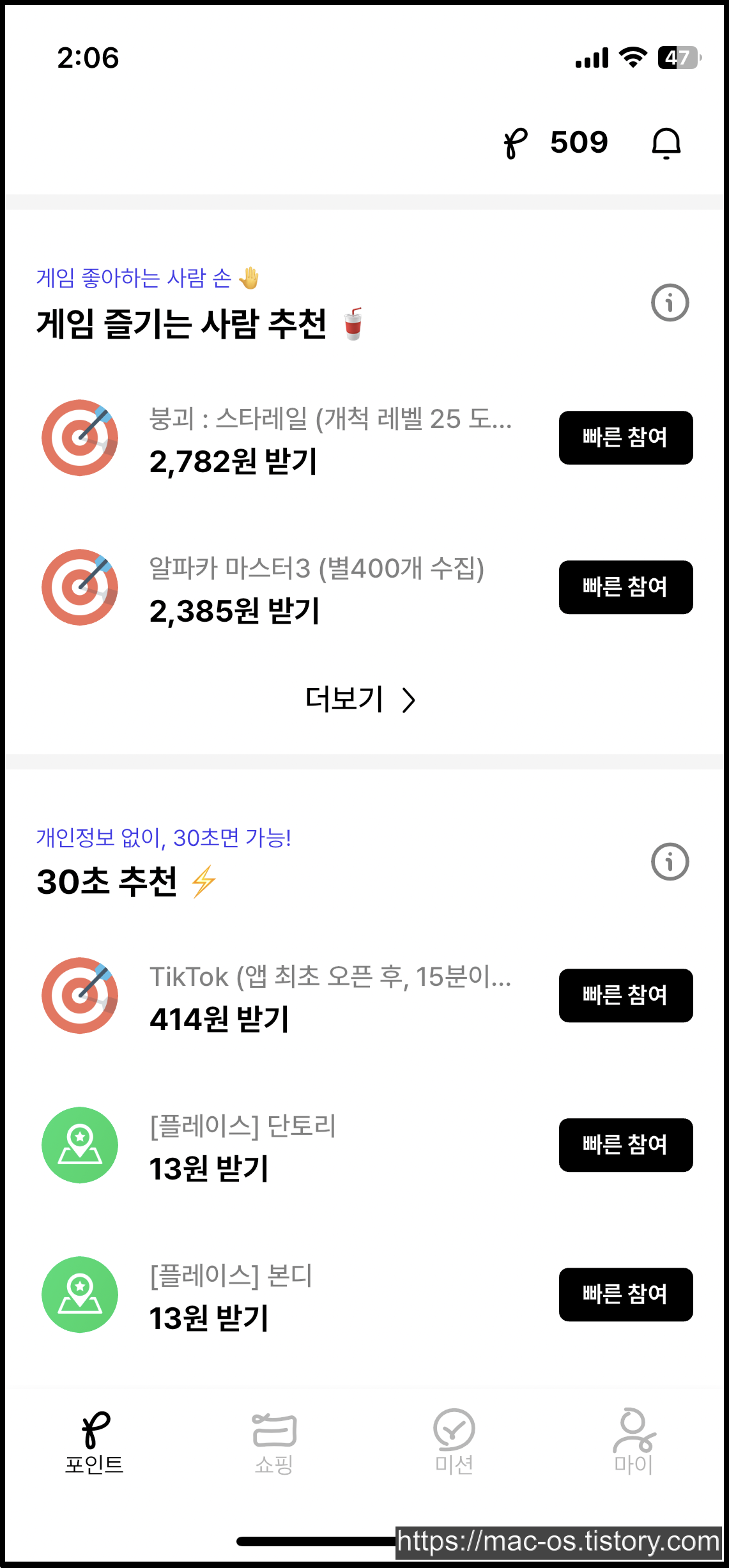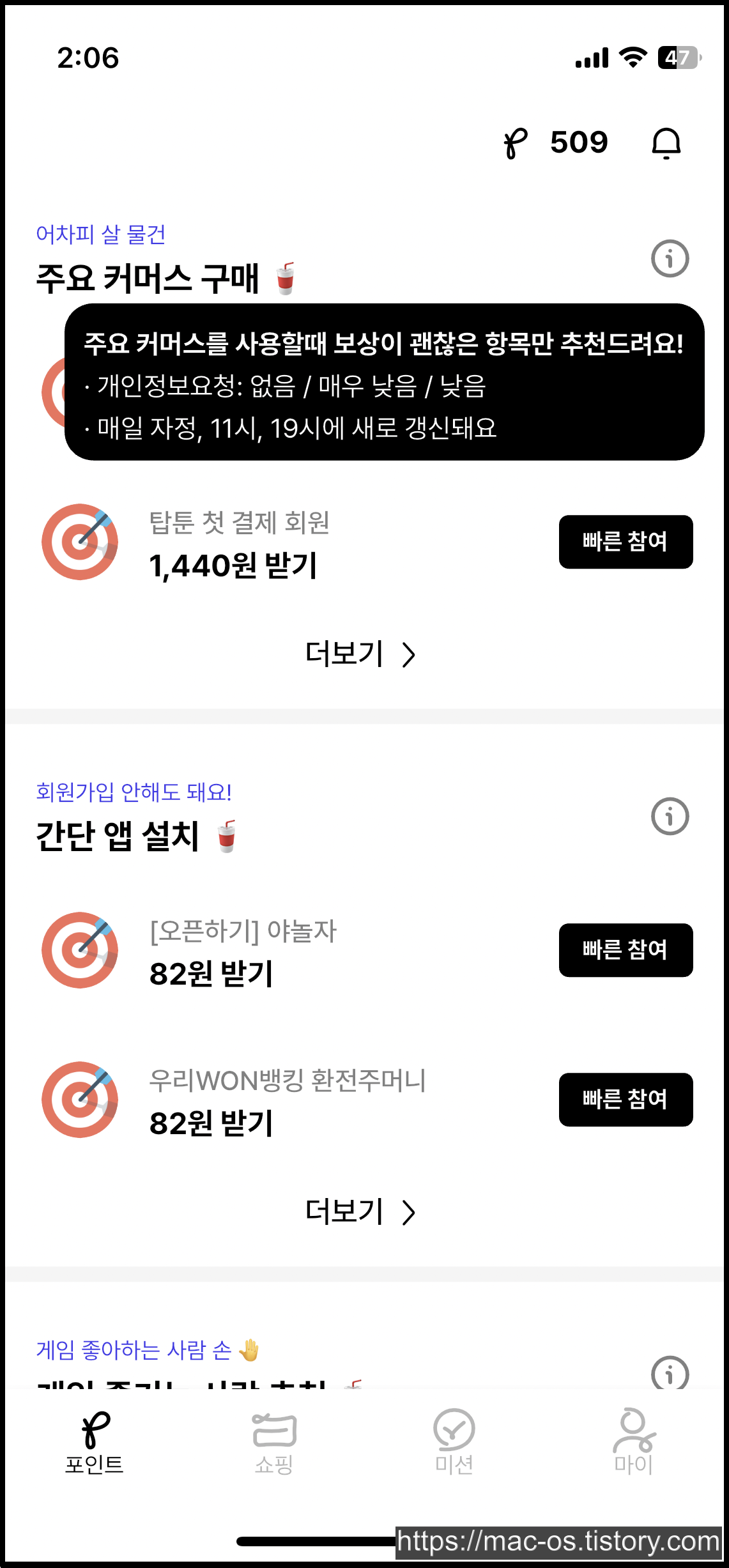 포인트 탭에서 아래로 스크롤을 내리면 주요 커머스 구매, 간단 앱 설치, 모바일 게임 레벨 달성, 개인정보 없이 30초만에 끝나는 광고들이 보인다. 특히 커머스 구매랑 모바일 게임 레벨 달성 광고가 상당히 괜찮은 것 같다.
