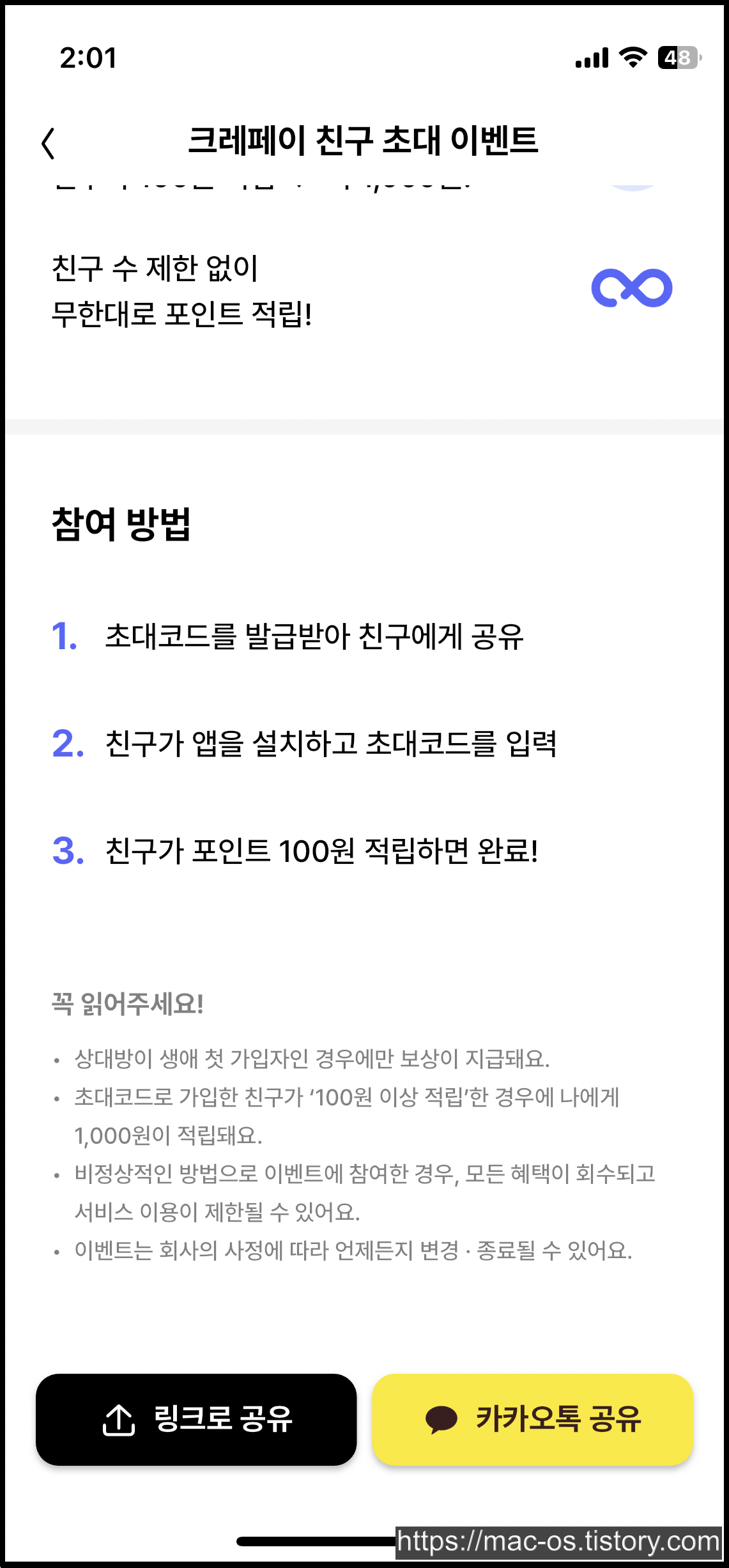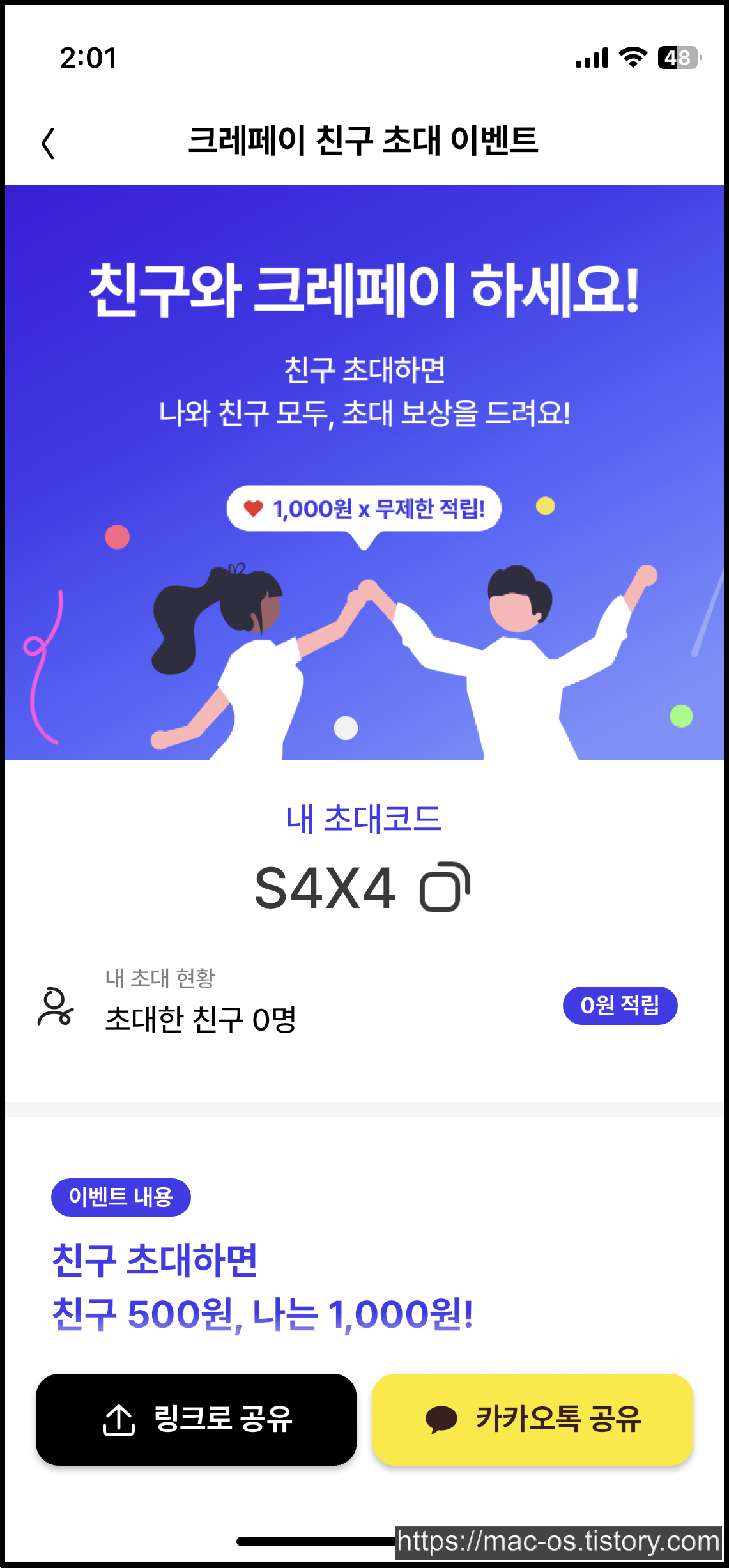 친구를 초대하면 친구는 500원, 나는 1,000원을 받을 수 있다.