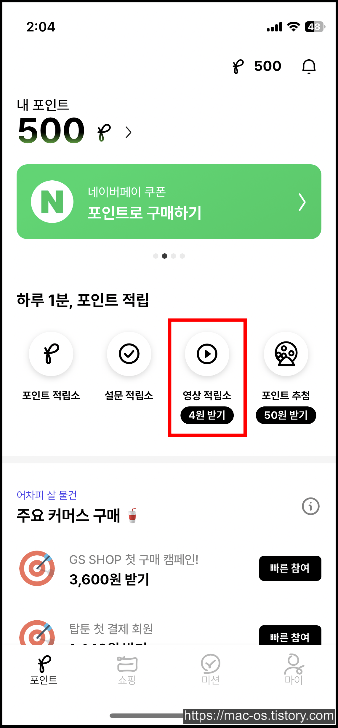 영상 적립소를 누르면 광고 영상이 나오는데 끝까지 시청하면 4원이 적립된다. 하루에 4번까지 가능하고 12시가 되면 적립 횟수가 초기화된다.