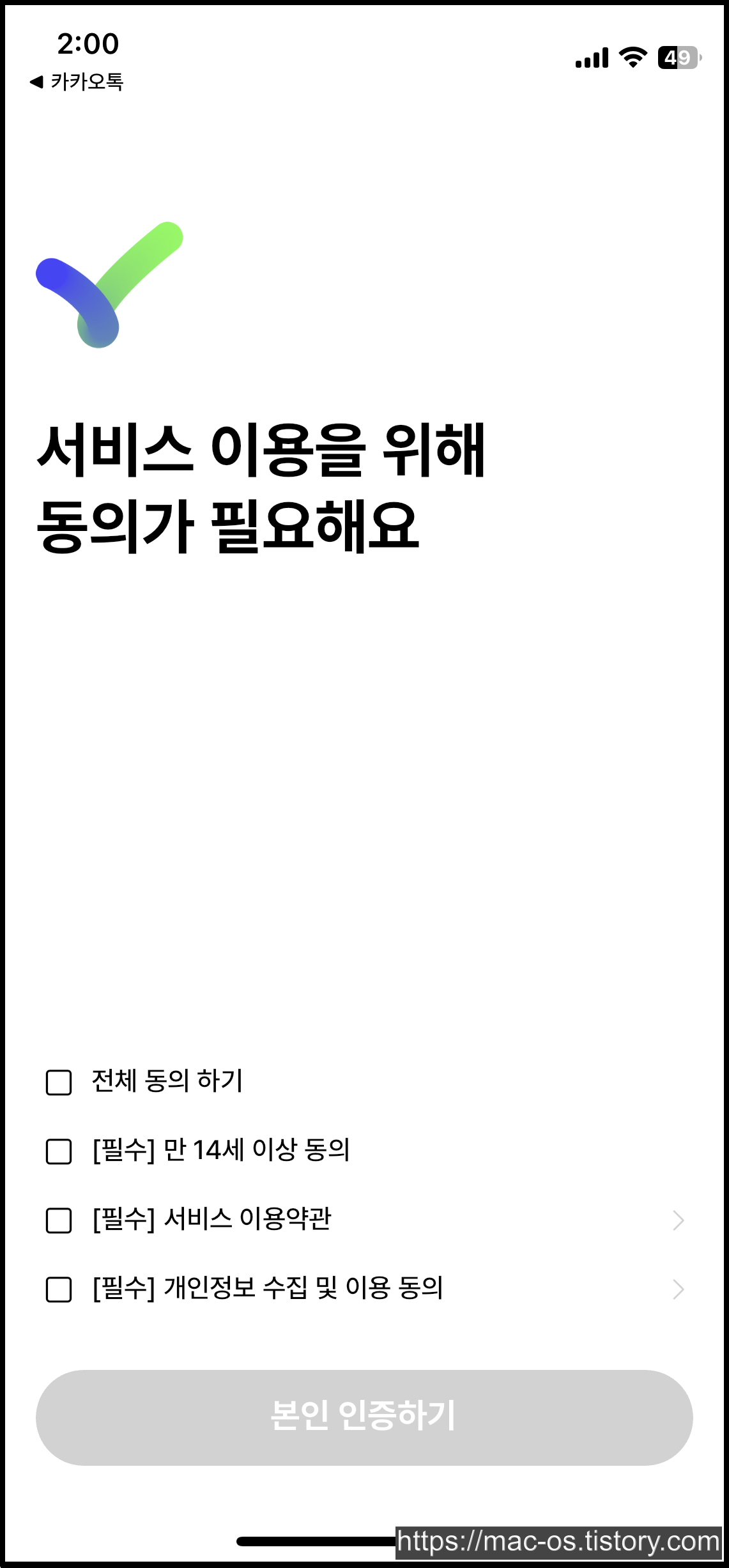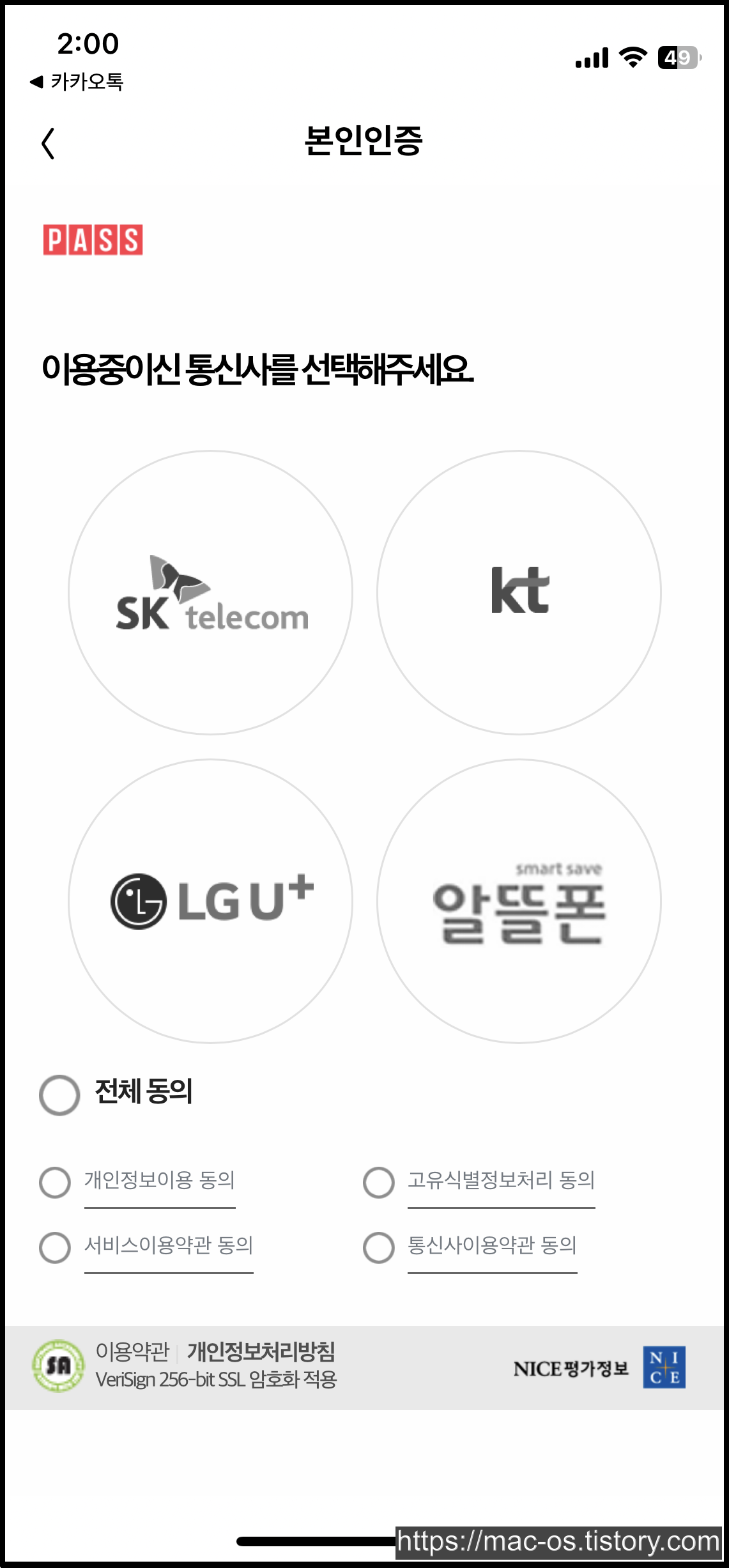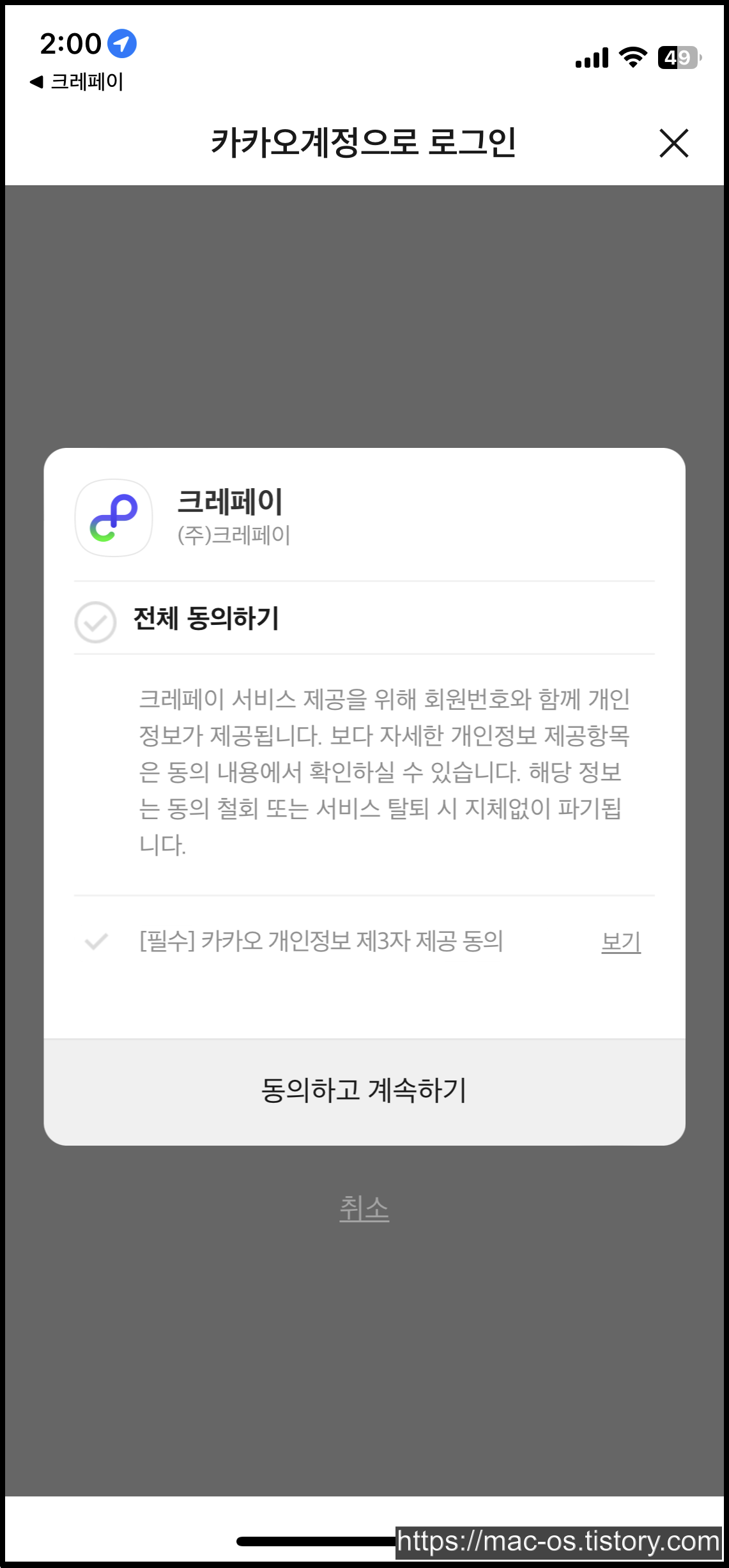 카카오 계정 로그인을 하고 이용동의에 체크한다.