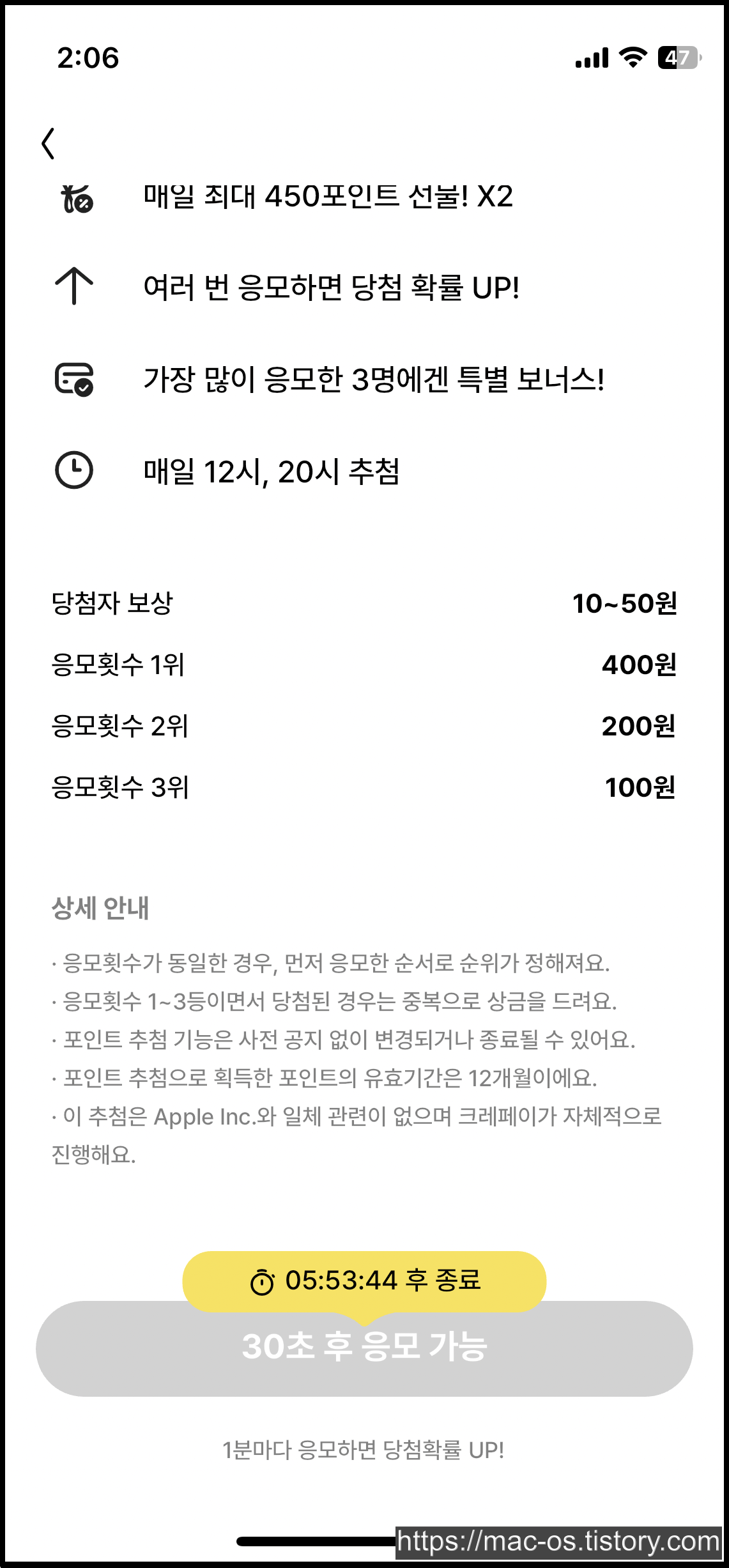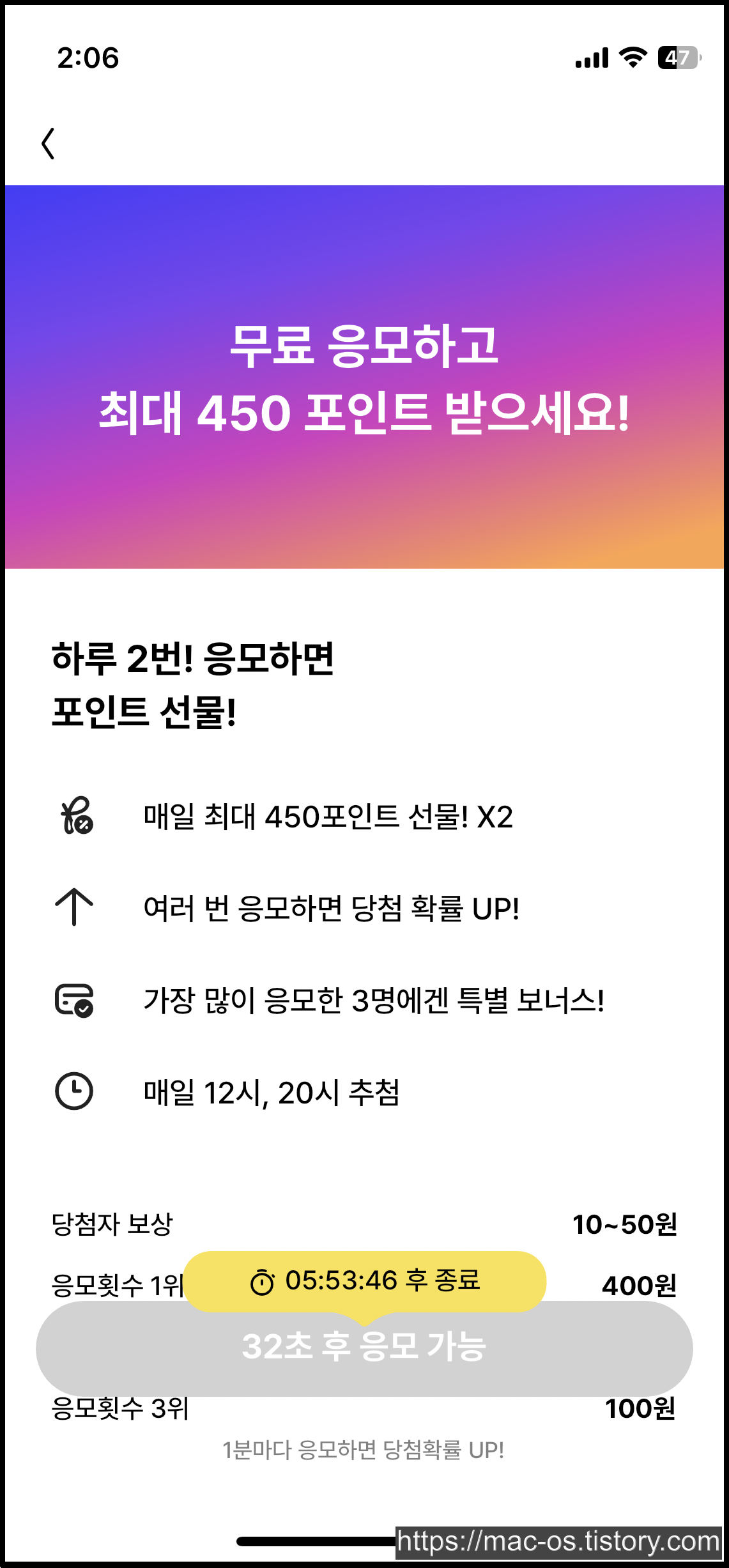포인트 추첨을 누르면 아까처럼 광고가 나오는데 광고를 다보면 응모 1회가 완료된다. 매일 12시와 20시에 추첨하고 응모횟수가 가장 높은 3명에게 포인트를 지급한다.