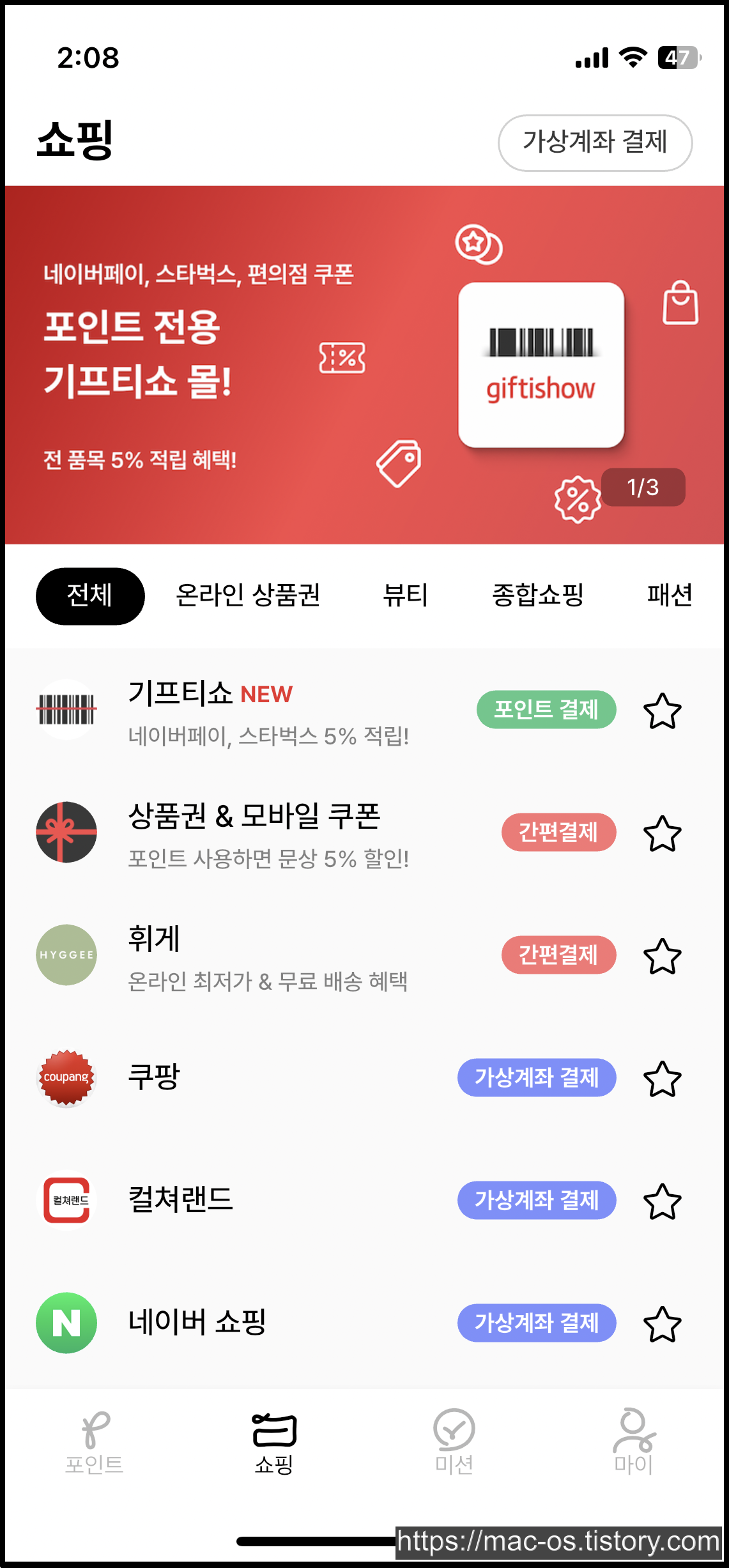 - 적립한 포인트는 기프티콘, 상품권 등을 구매하는 데 사용하거나 쿠팡, 컬처랜드, 네이버 쇼핑에서 가상계좌 결제로 현금처럼 사용할 수 있음