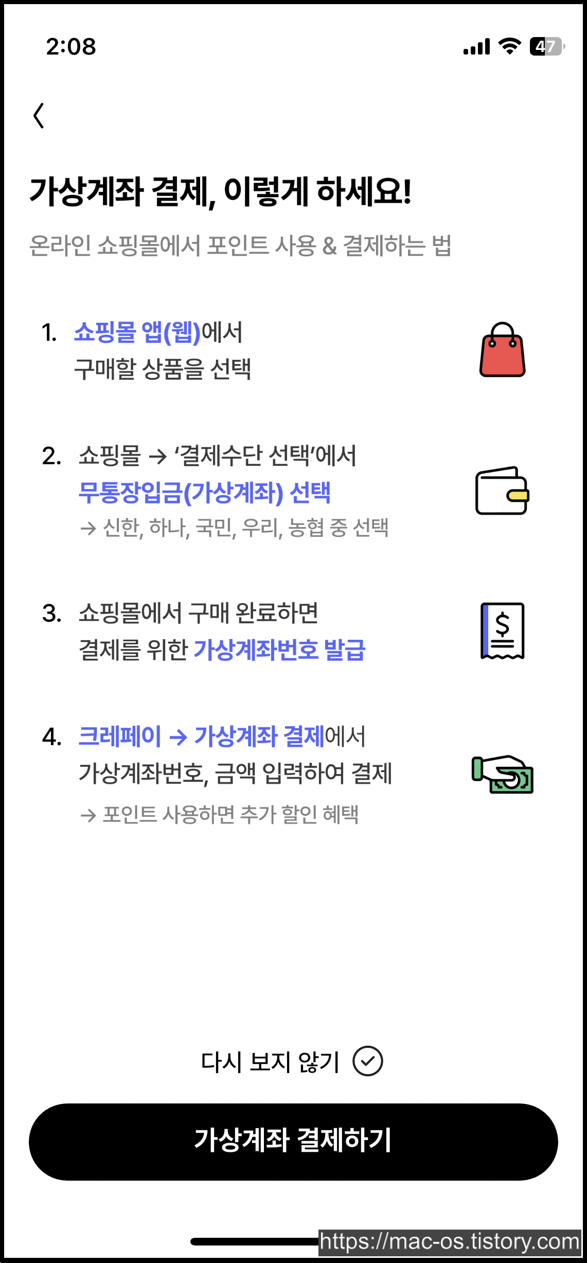 그리고 쇼핑몰에서 구매 완료하면 결제를 위한 가상계좌번호가 발급되는데, 이 가상계좌를 크레페이에서 입력하면 크레페이 포인트를 현금처럼 결제에 이용할 수 있다는 것이다.