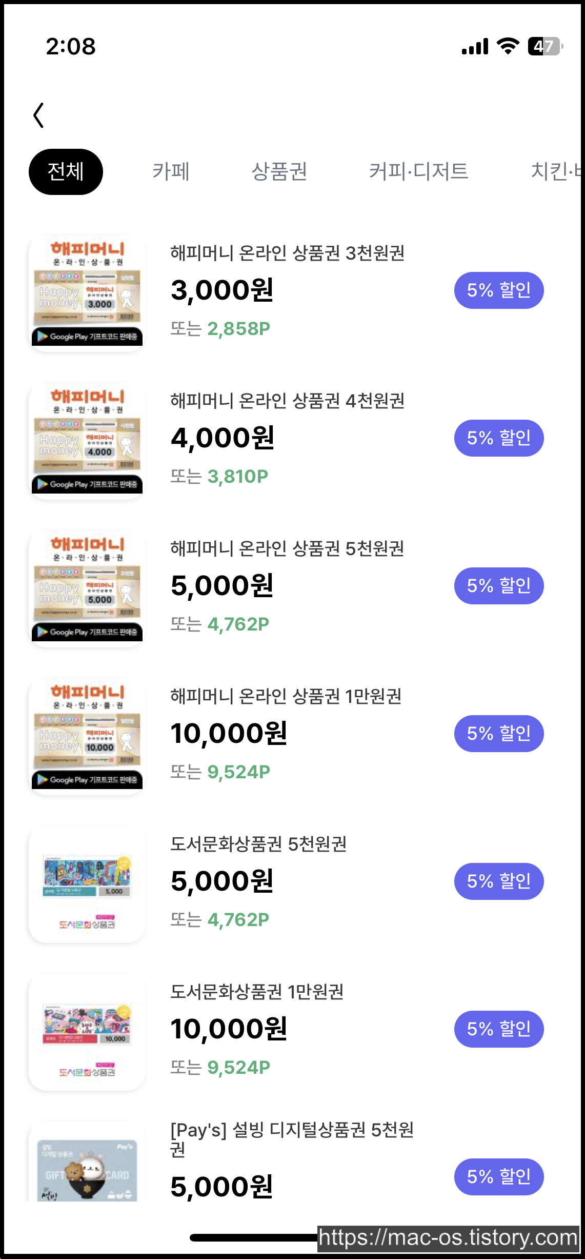 크레페이에서 얻은 포인트는 어디에 사용할 수 있을까? 우선 기프티쇼와 상품권&모바일 쿠폰을 눌러 내가 원하는 기프티콘이나 상품권을 구매할 수 있다. 특이하게 포인트로 상품을 구매할 때 5% 할인해주거나 5% 포인트를 추가로 적립해준다.