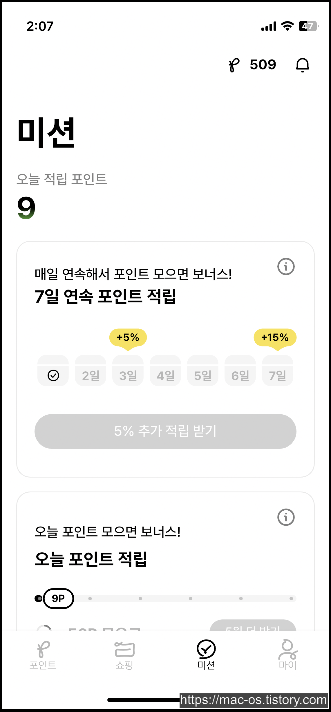 - 매일 연속해서 포인트를 모으면 3일에 +5%, 7일에 +15% 보너스를 지급하고, 하루에 일정 포인트를 모으면 추가로 포인트를 제공함