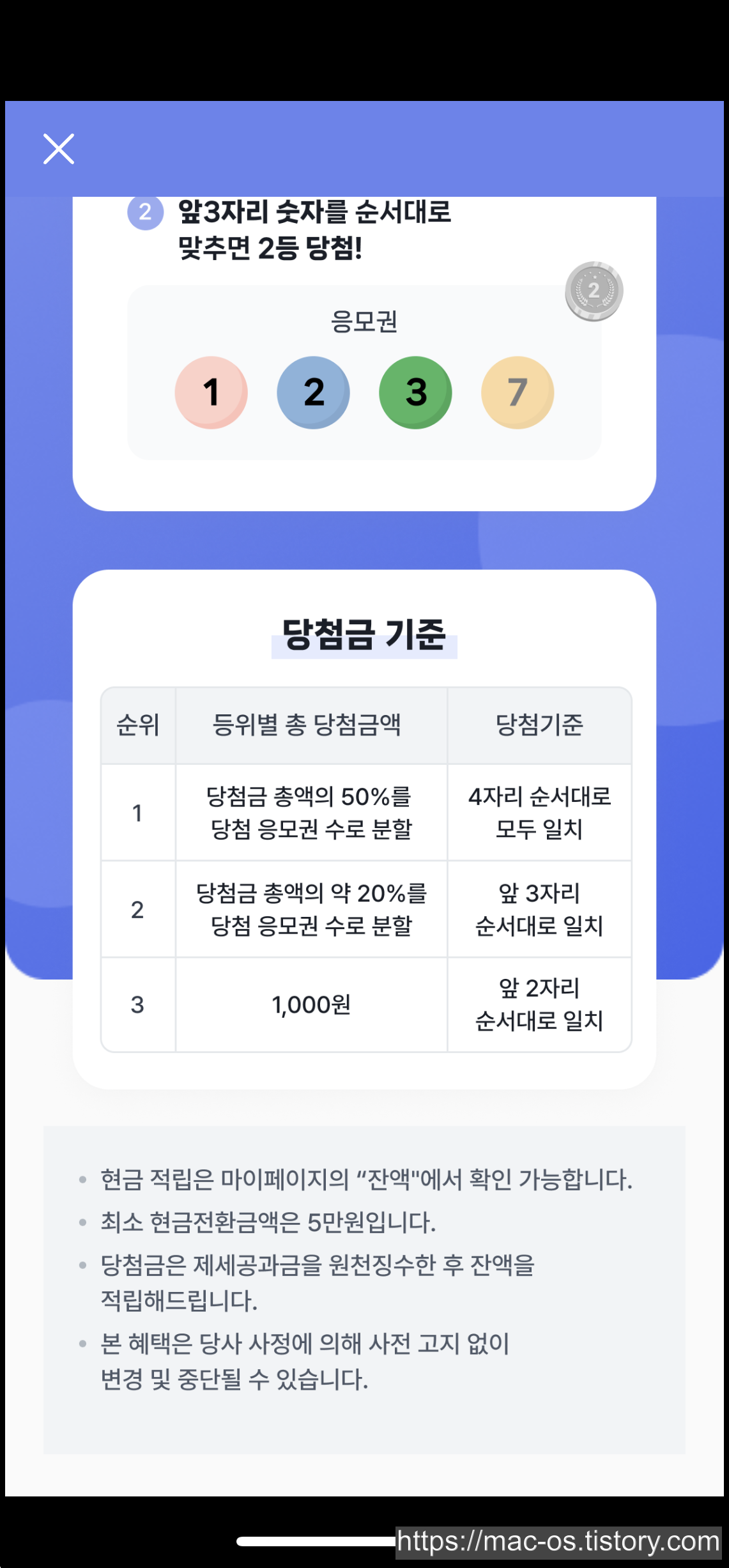 할인 정보를 5개 볼 때마다 코인이라는 것을 1개씩 준다. 그럼 할인 정보 15개를 보면 코인 3개를 준다는 거다. 코인 3개를 사용해서 로또에 응모할 수 있다.