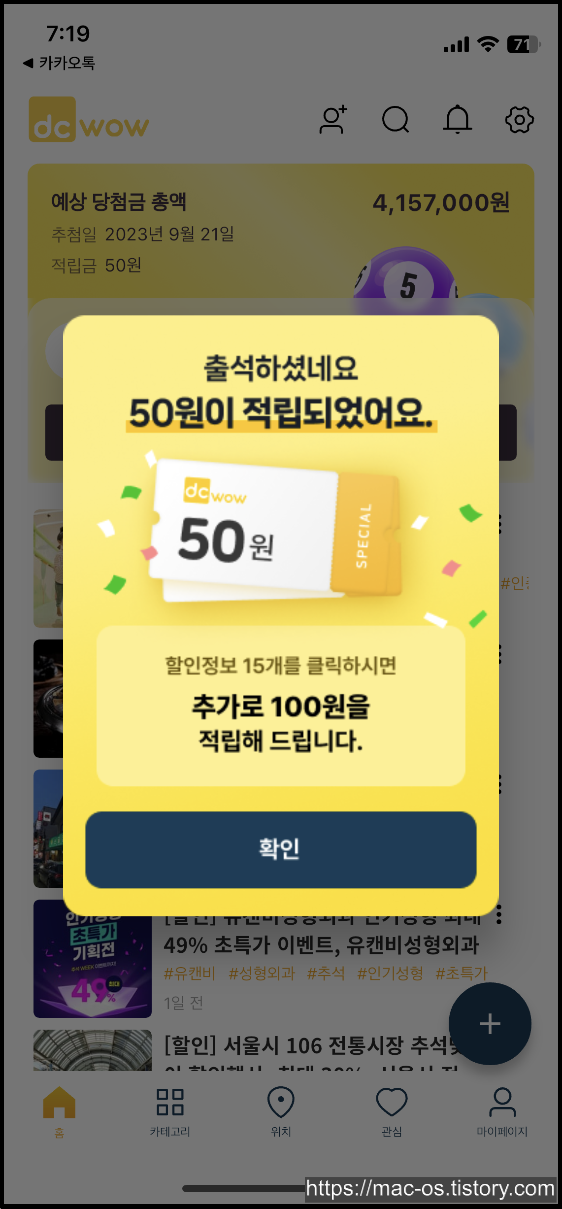 디씨와우는 할인정보를 보면 돈과 코인을 주는 앱이다. 돈은 현금이라 보면 되고, 코인은 3개를 모을 때마다 매주 진행되는 로또에 1번 참여할 수 있다.