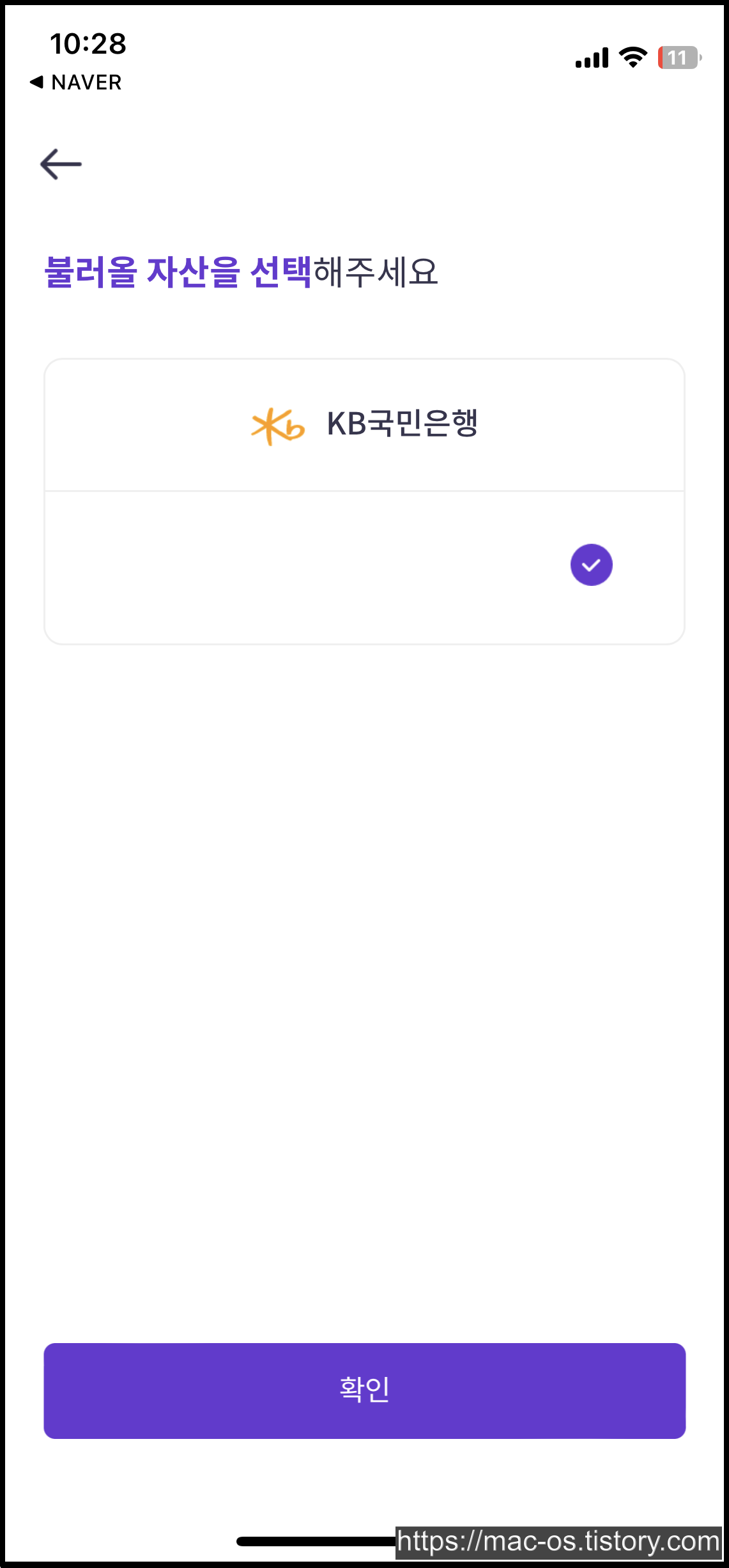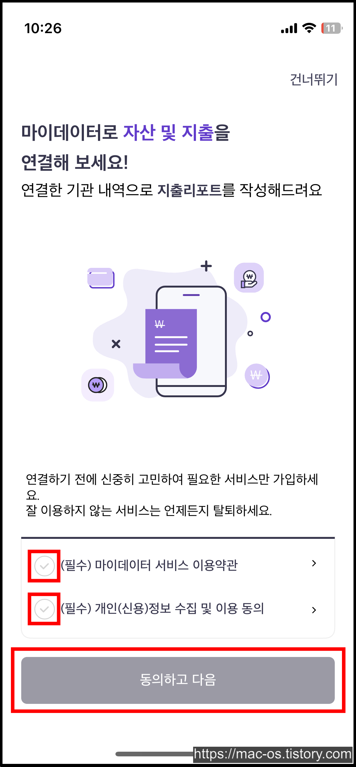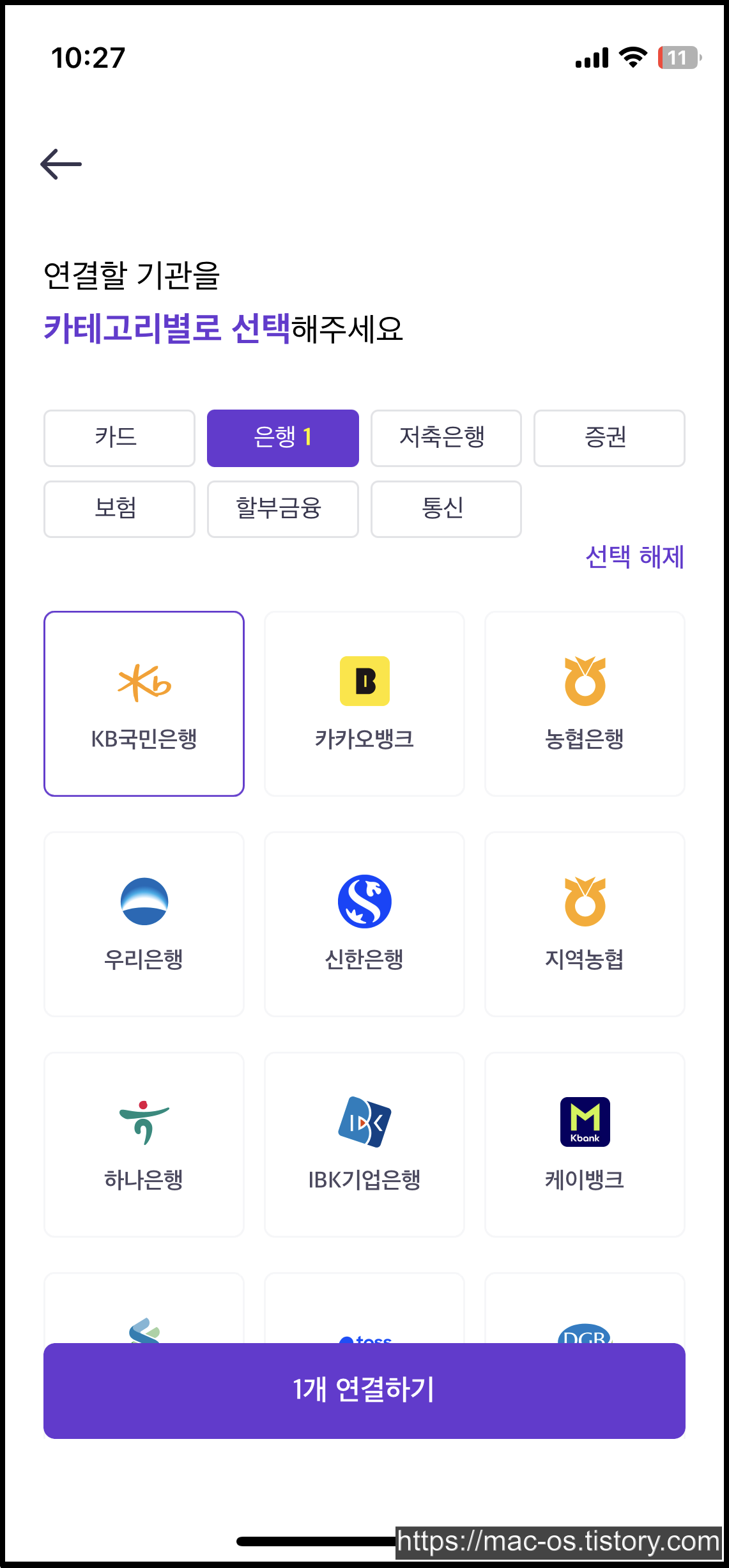 이용약관과 동의에 체크하고 은행 1개만 선택해서 연결한다. (최소 1개 이상 선택)