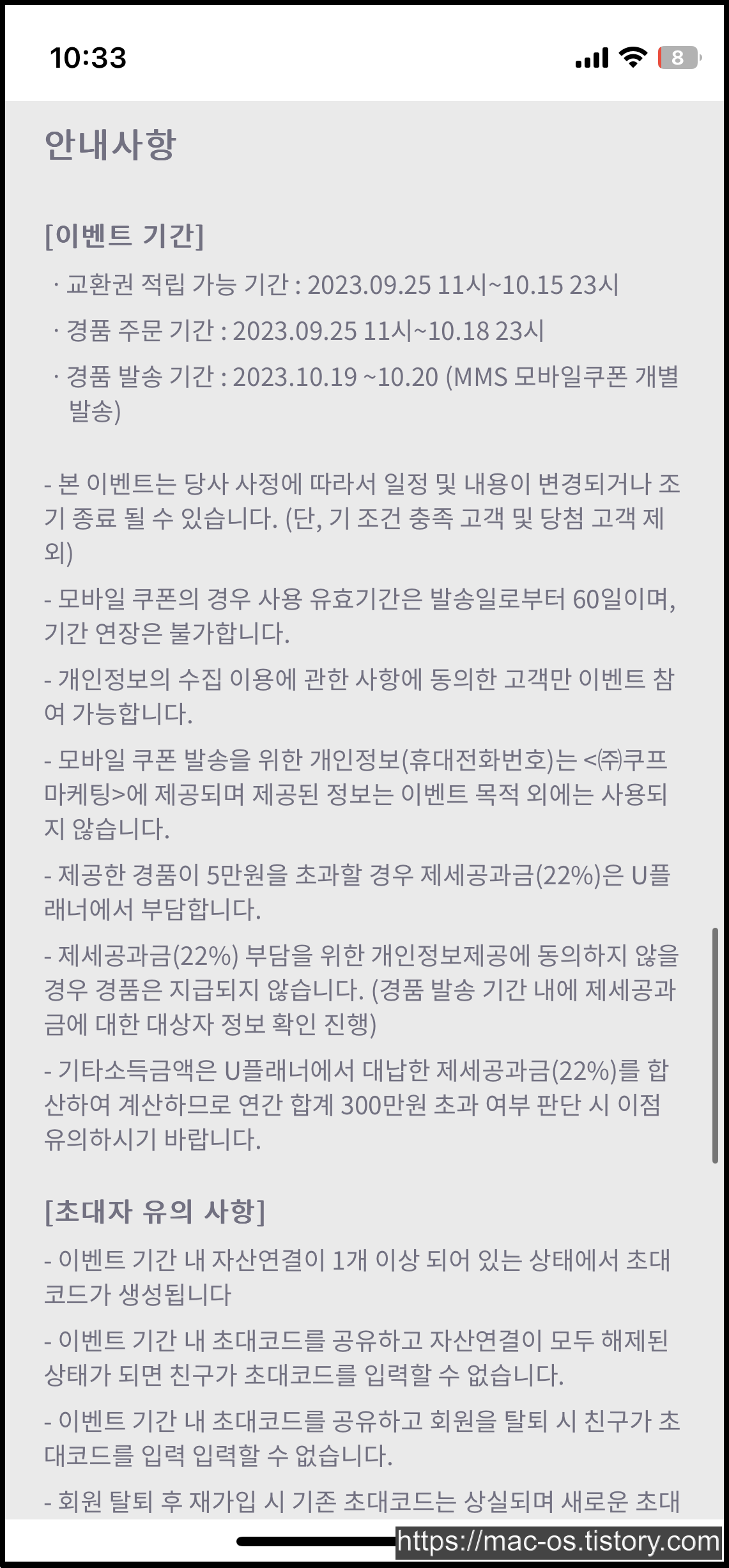 이벤트 안내사항을 살펴보자. 경품은 10월 19일부터 10월 20일에 발송된다. 교환권 적립 가능 기간은 10월 15일까지라서 이 때까지 까먹지 않고 쓰는게 좋을 것 같다.