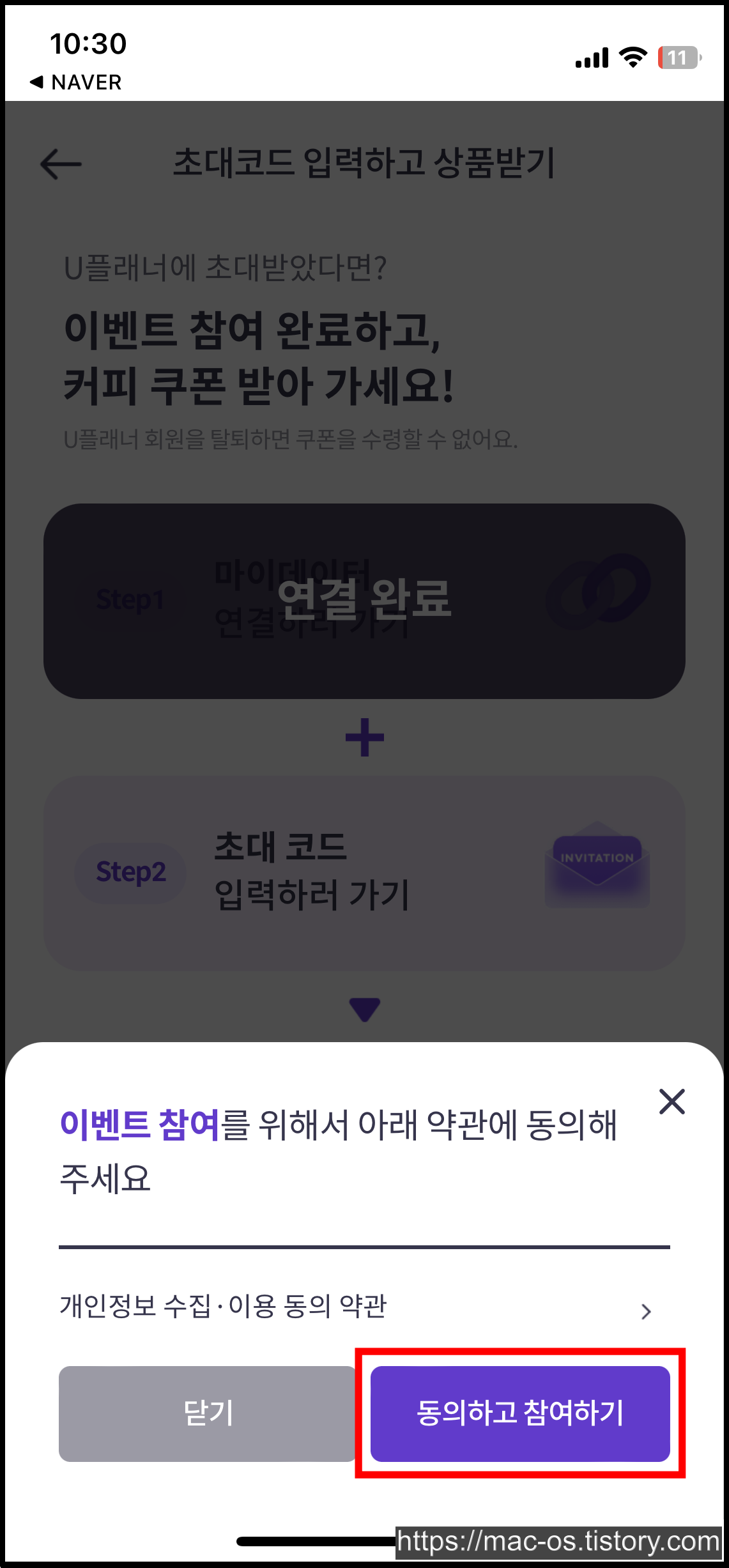 [Step2 초대코드 입력하러 가기] → [동의하고 참여하기]를 누른다.