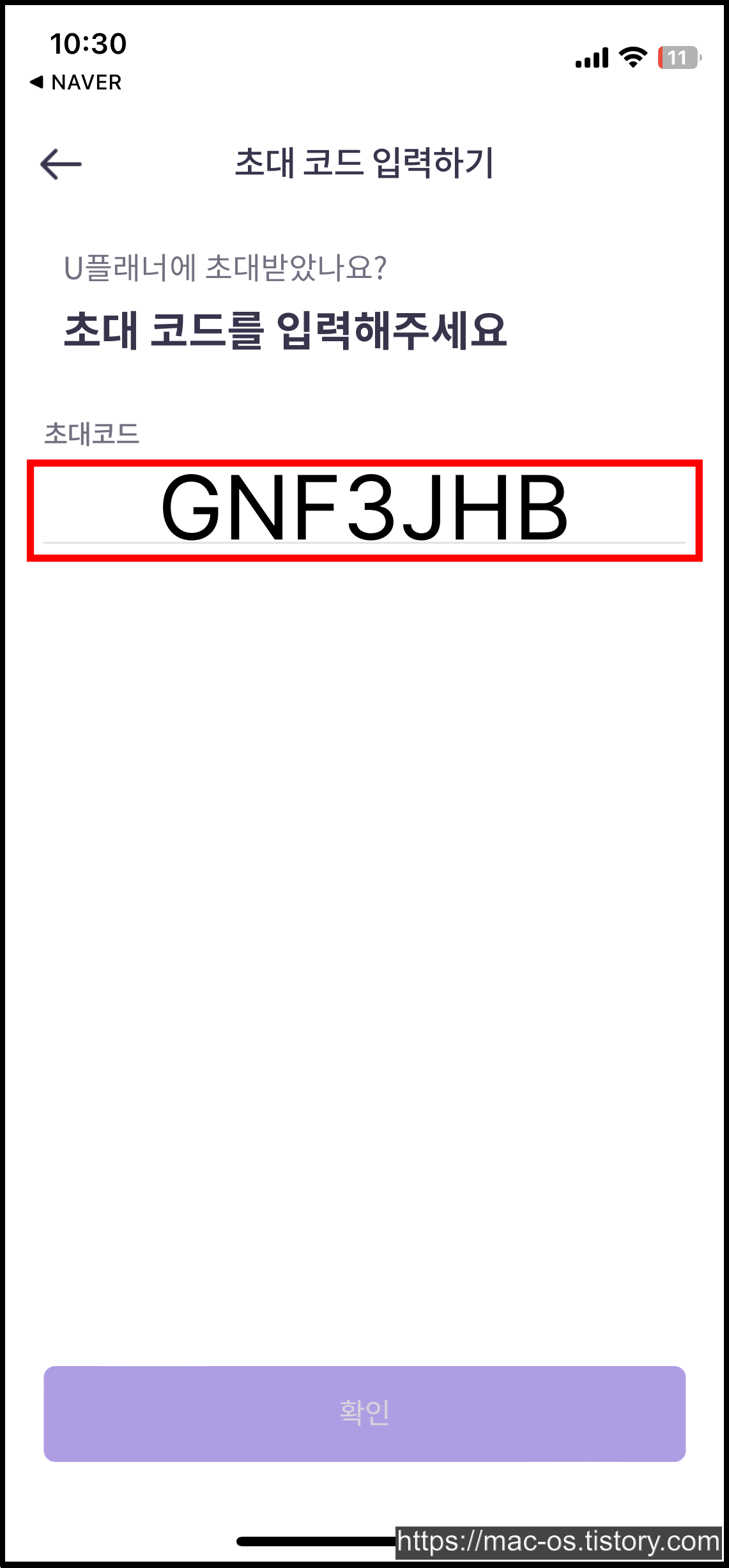 초대코드 입력하기 페이지에서 GNF3JHB를 복사해서 붙여넣기한다.