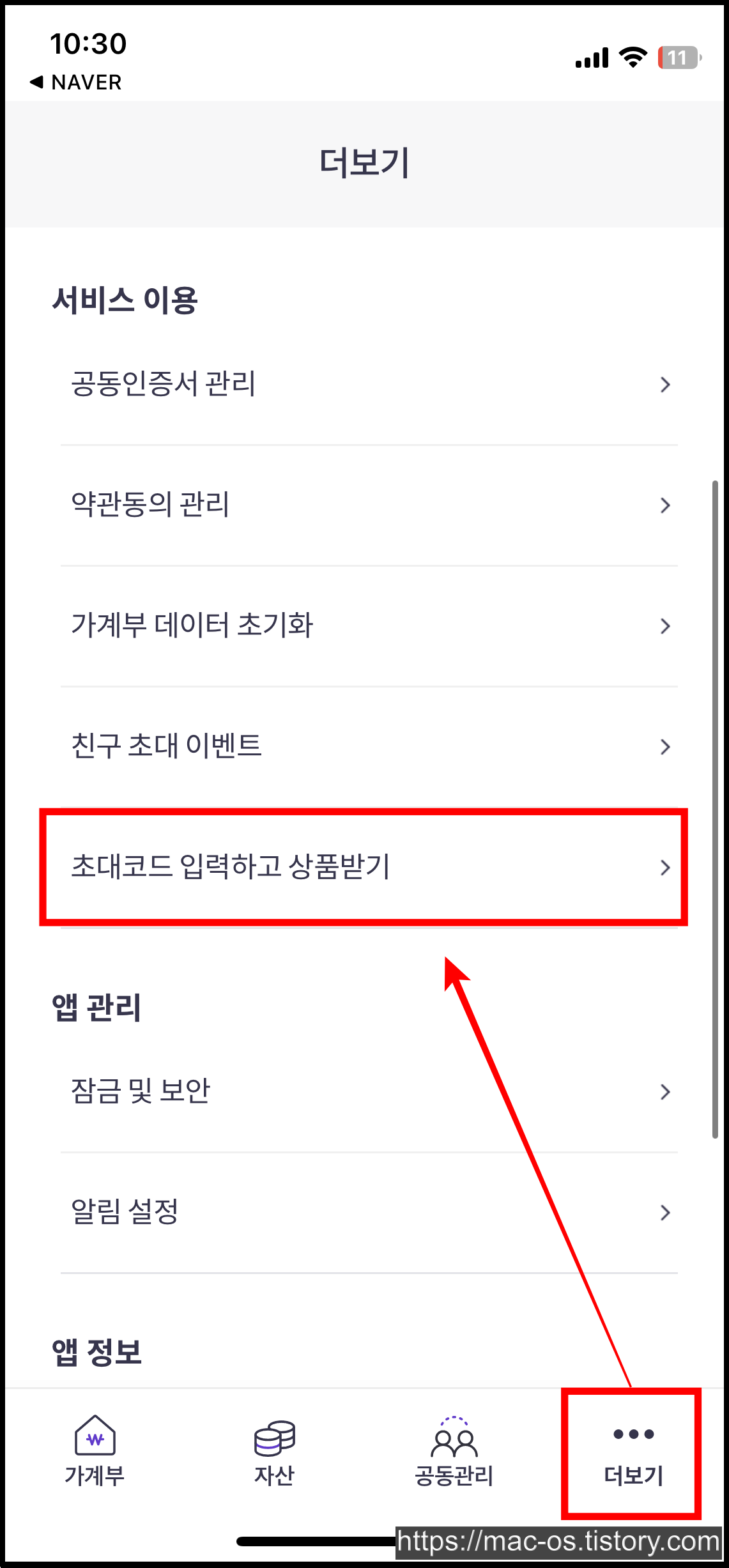 - [더보기] → [초대코드 입력]으로 이동