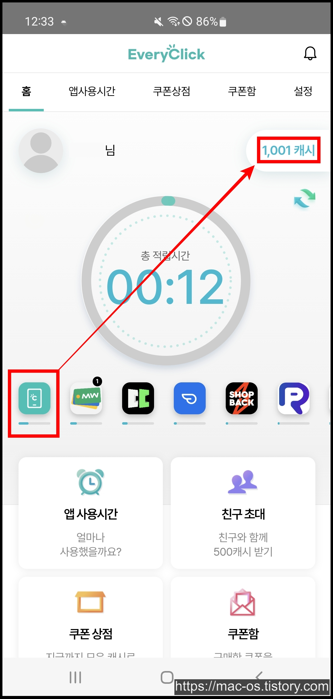 이후 휴대폰을 사용하다 보면 앱마다 사용한 시간이 나타나고, 5분당 2캐시가 적립된다. 앱에 있는 숫자 부분을 터치하면 1번 누를 때마다 1캐시가 적립되는 식이다. 하루에 최대 100캐시까지 적립할 수 있다.