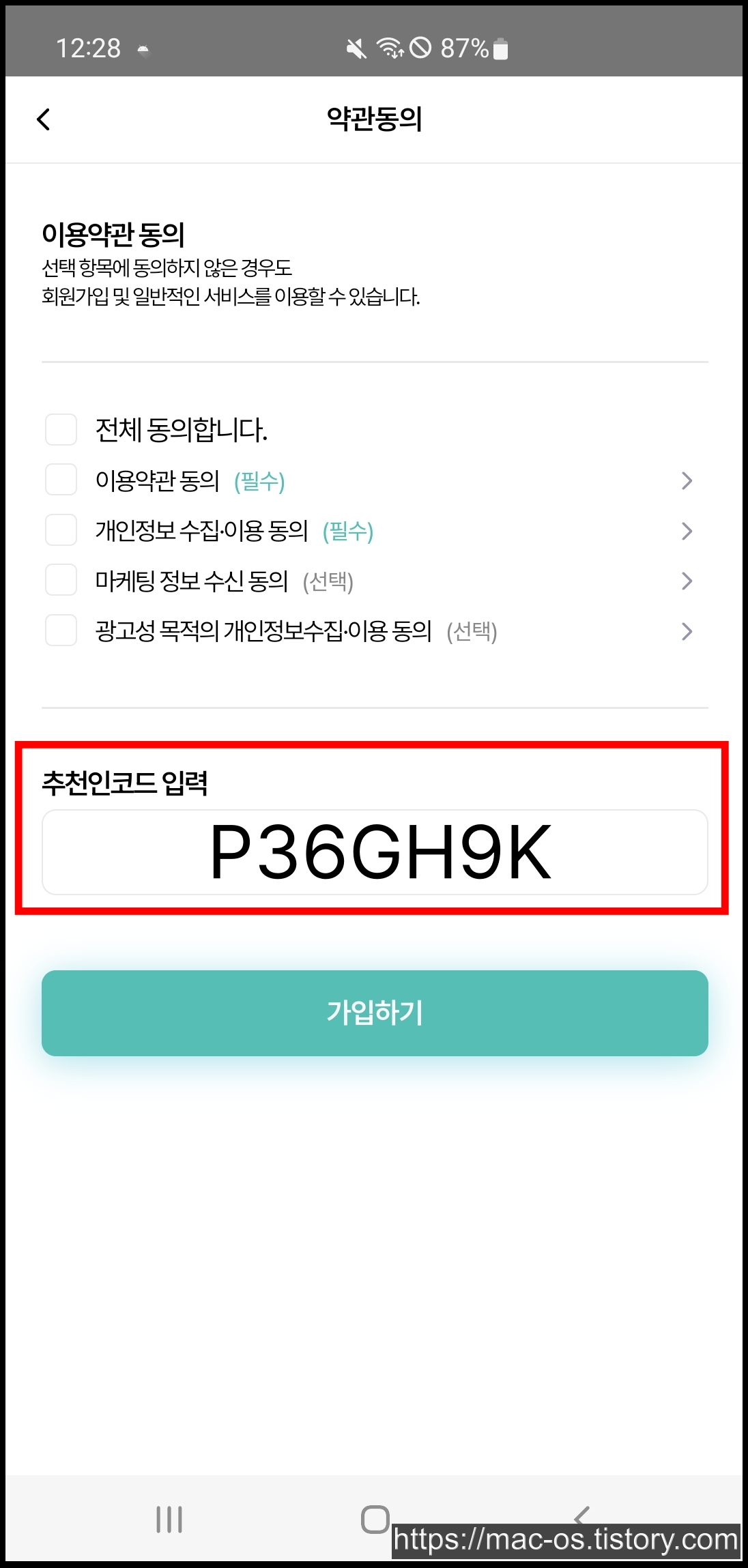 - 약관동의 페이지에서 추천인 P36GH9K 입력