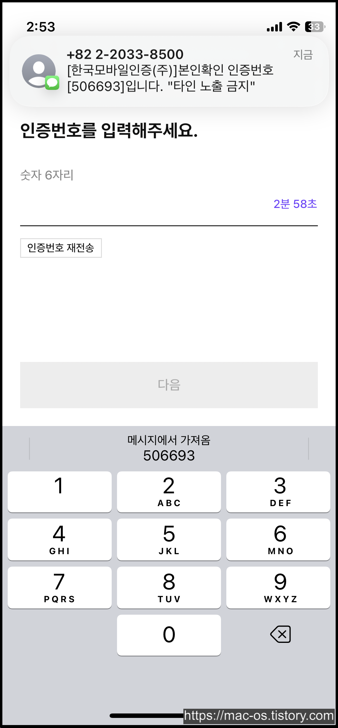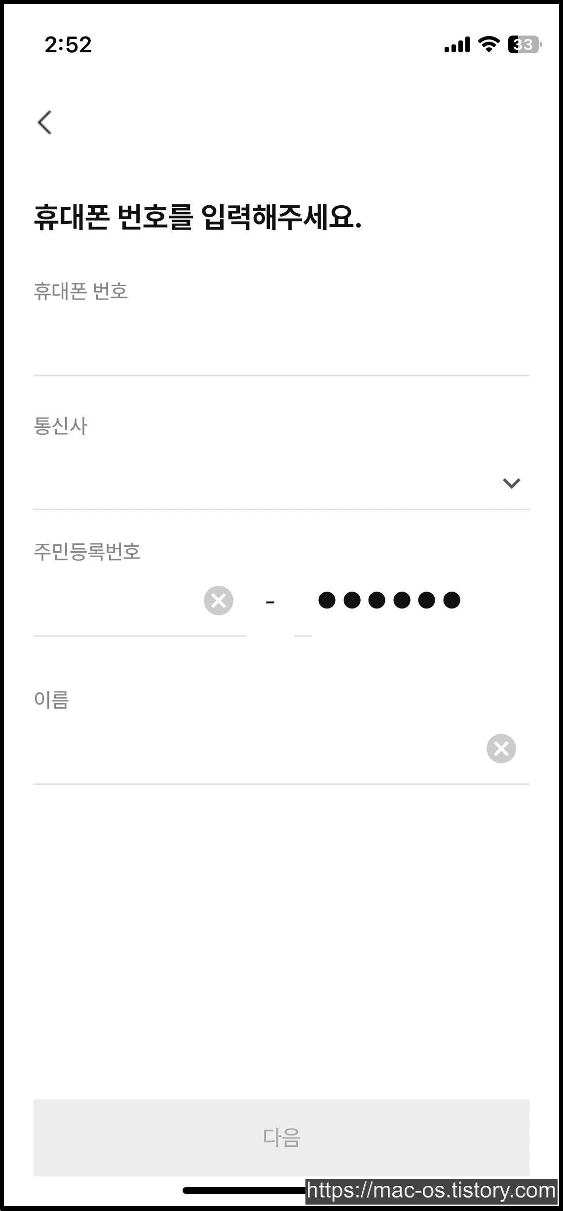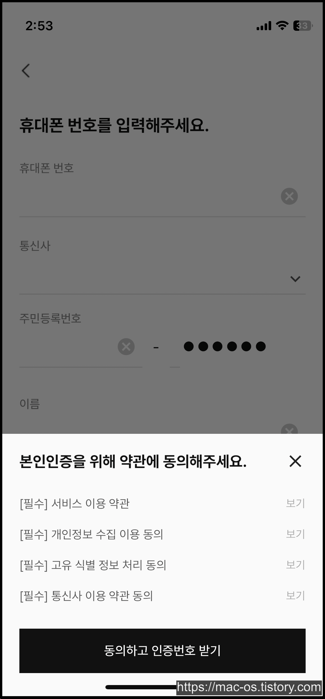 이름, 주민등록번호 앞자리, 통신사, 휴대폰 번호를 입력하고 약관에 동의합니다.