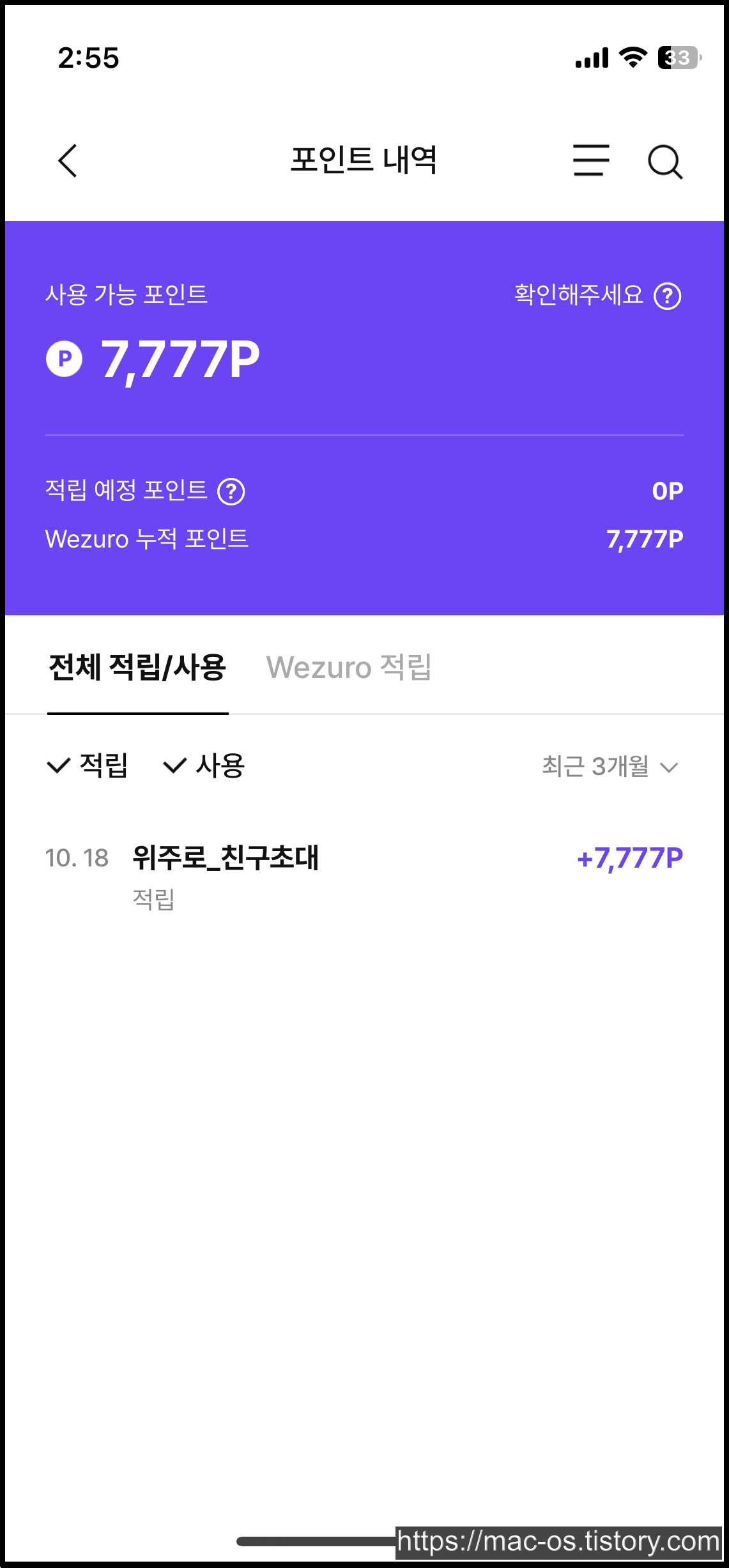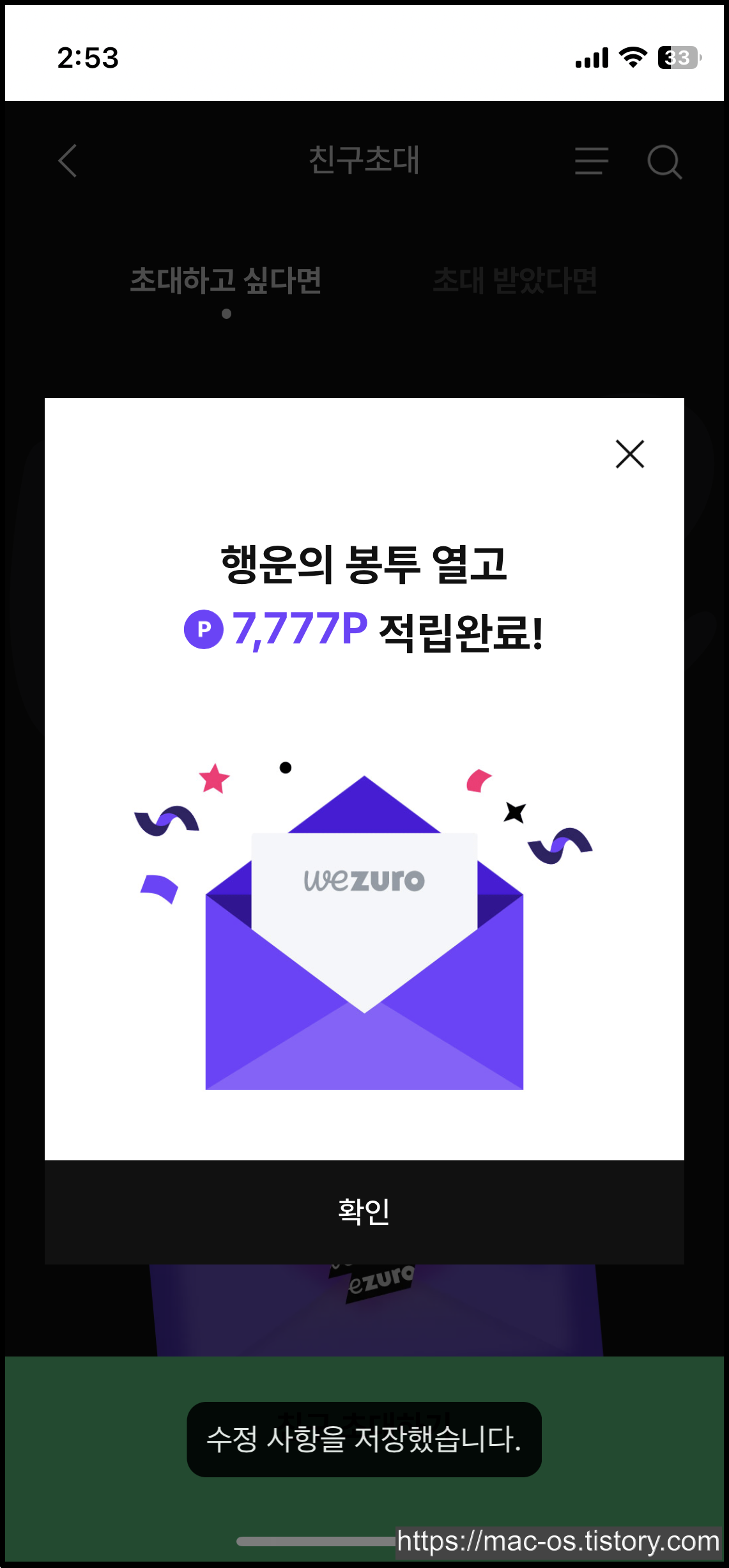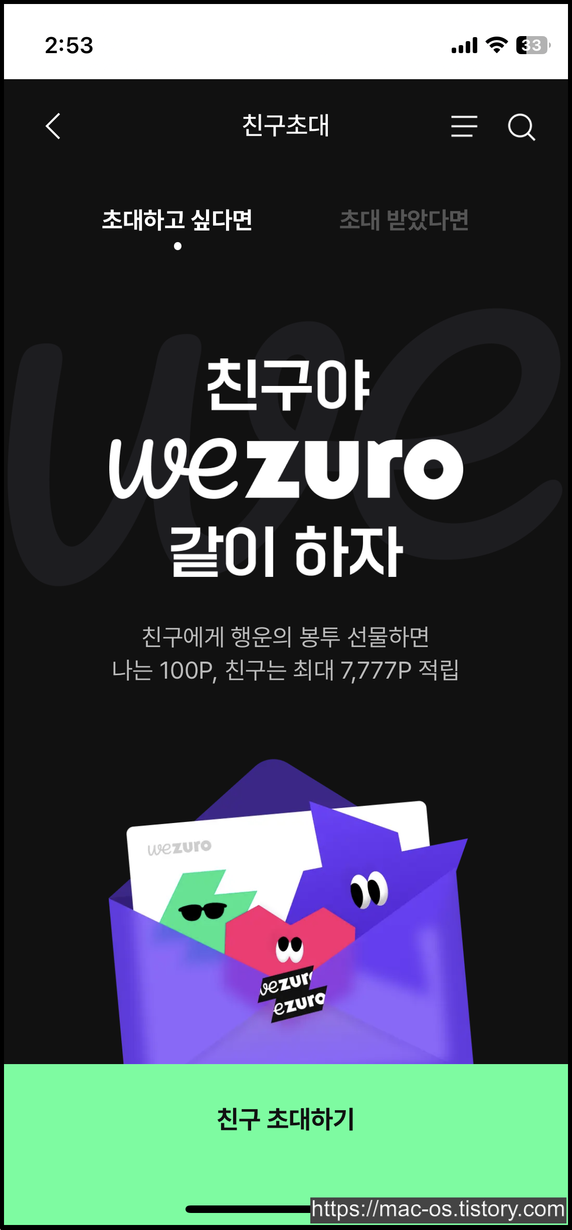 wezuro에서 진행하고 있는 친구초대 이벤트에 대해 살펴보겠습니다. 친구가 내 초대코드를 입력하면 친구는 행운의 봉투를 통해 최대 7777포인트를 받게 되고, 친구를 초대한 나는 100포인트를 받게 됩니다.