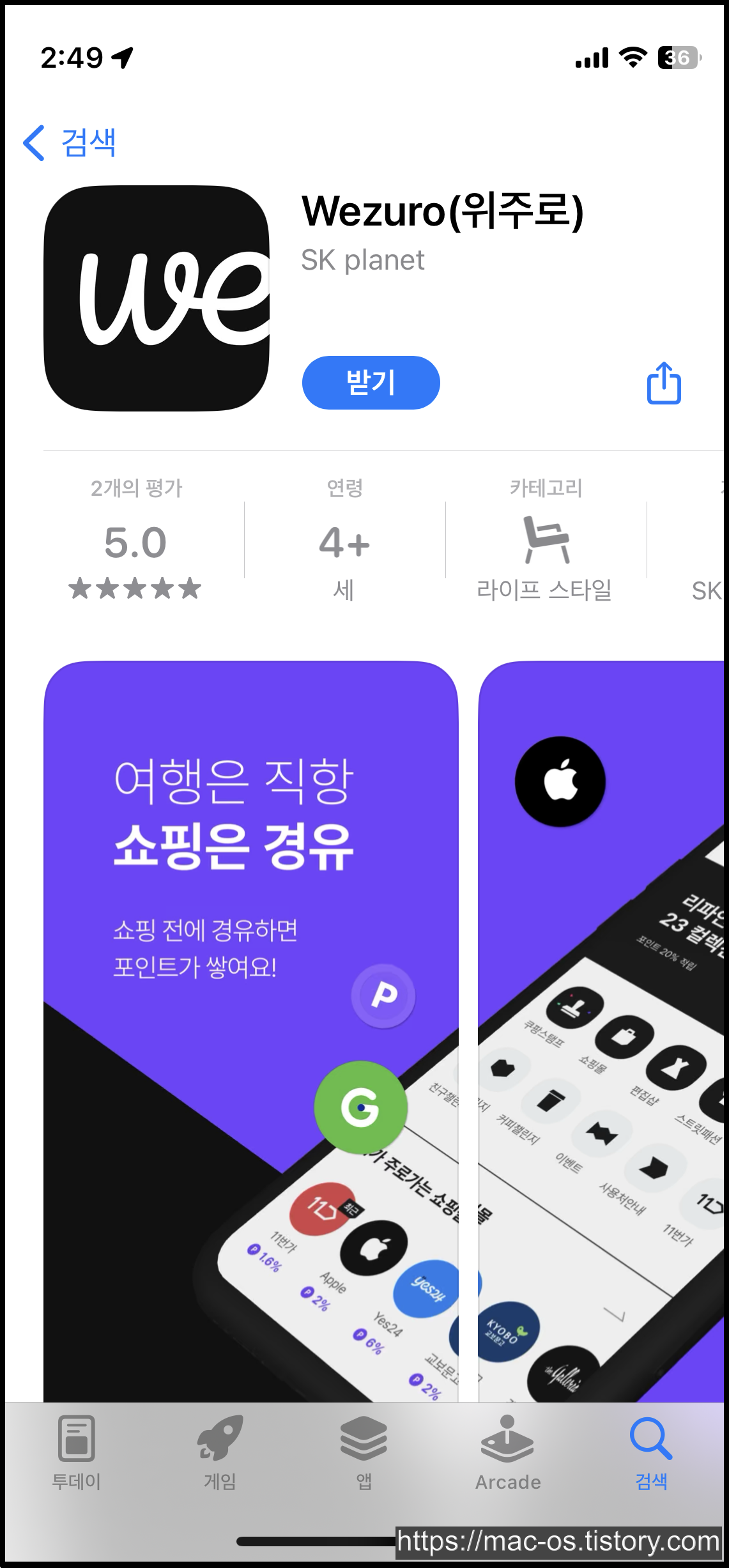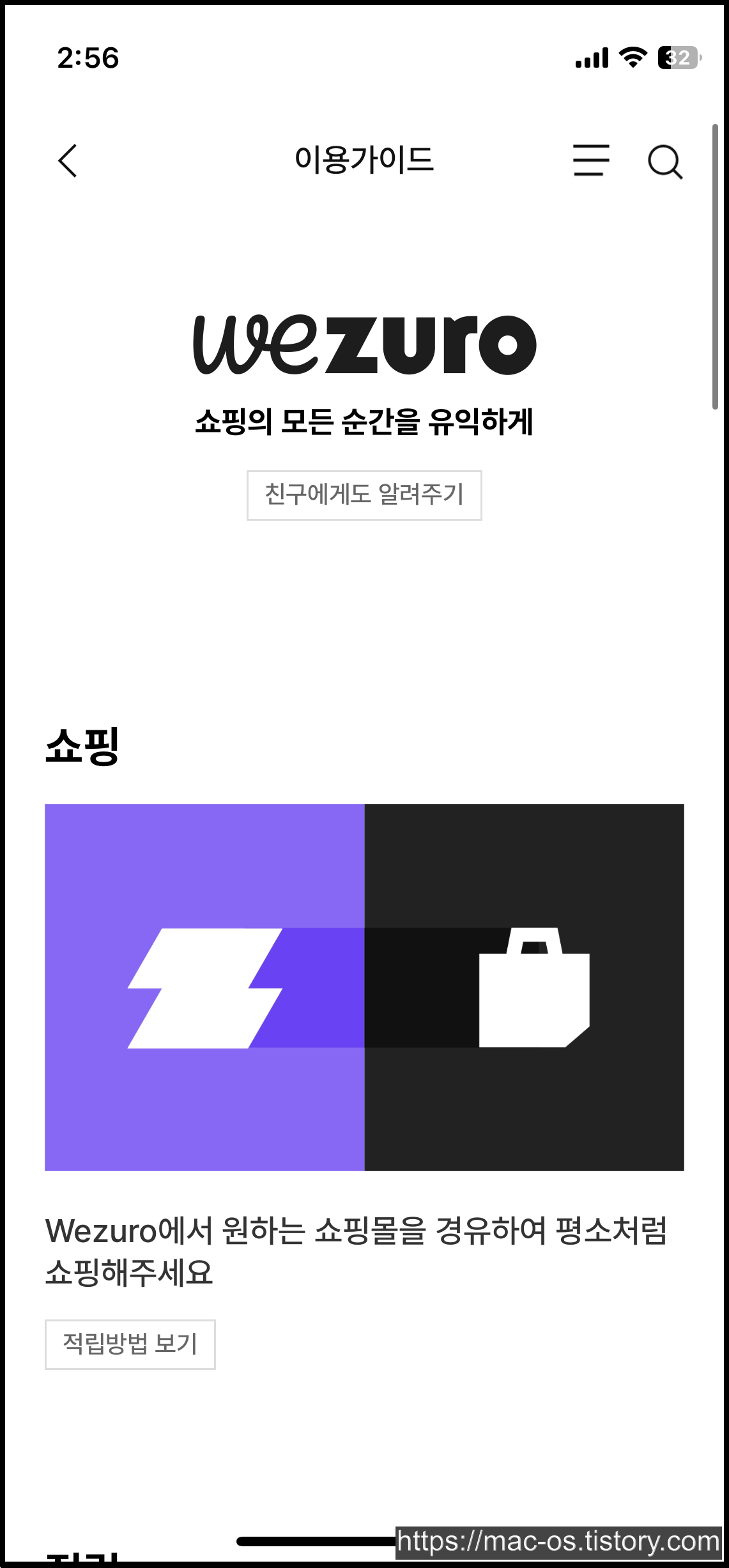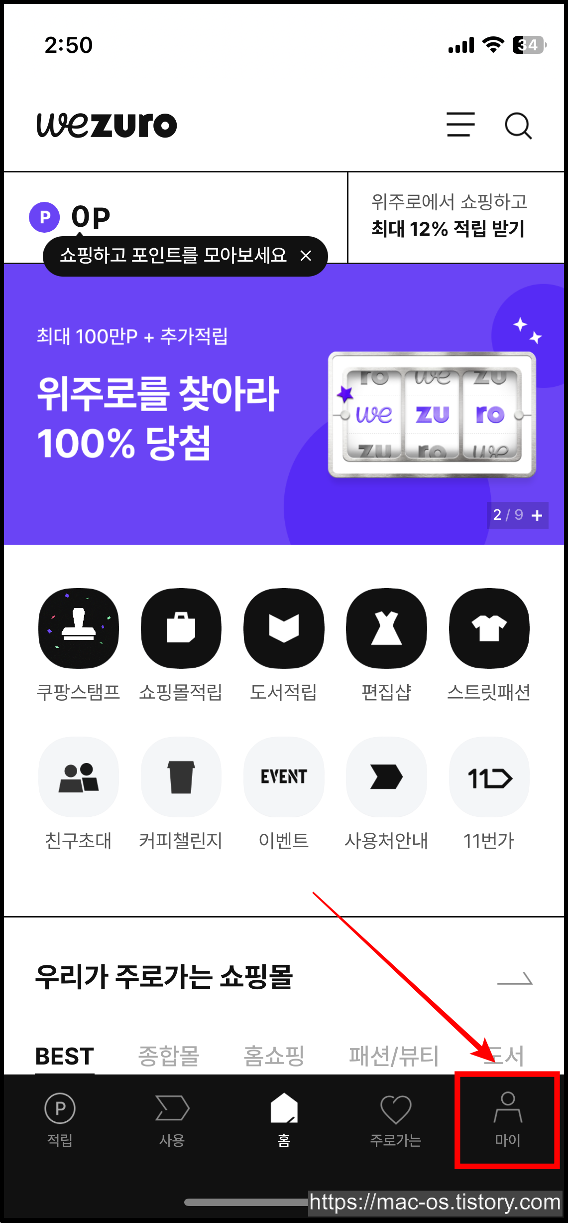 앱스토어에서 위주로 검색하면 나오고 구글 플레이 스토어는 wezuro라고 검색해야 나오는 것 같습니다. 앱 설치 후 우측 하단 [마이]를 누릅니다.