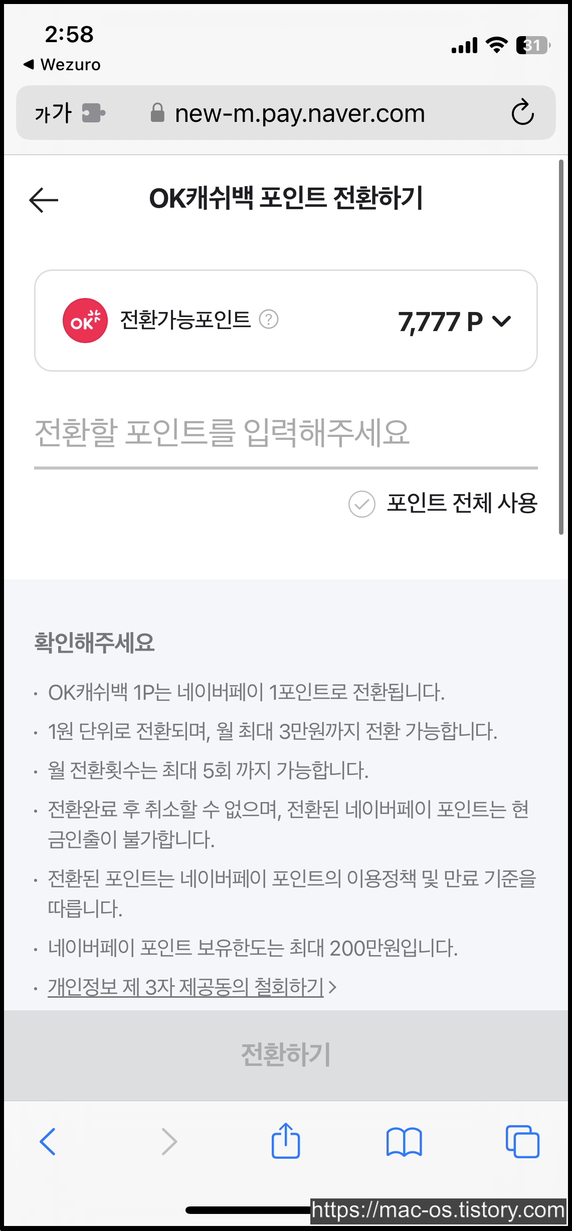 그러면 네이버페이 제휴포인트 전환 페이지로 이동하게 되는데, 여기서 OK캐쉬백 포인트를 네이버페이 포인트로 바꿀 수 있습니다.