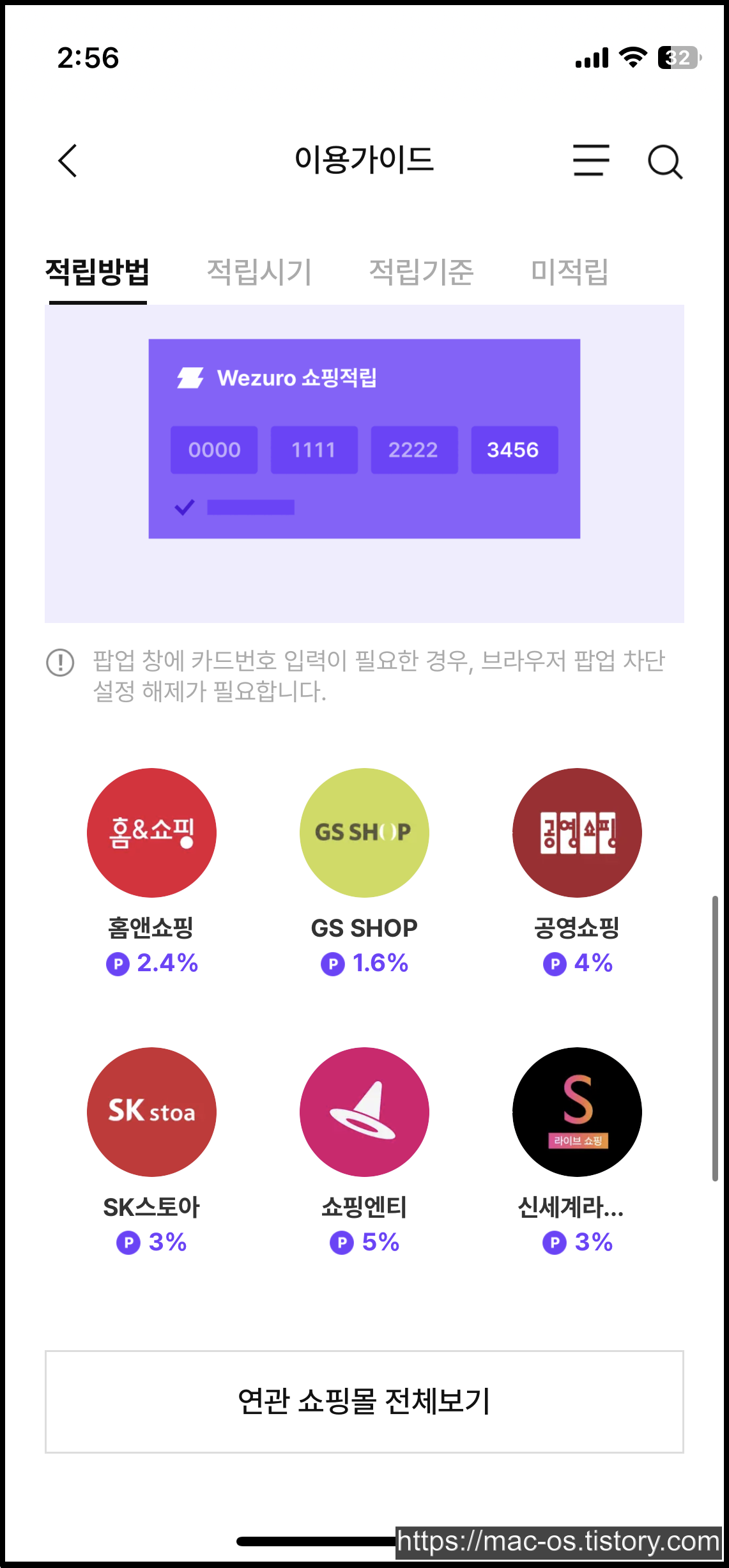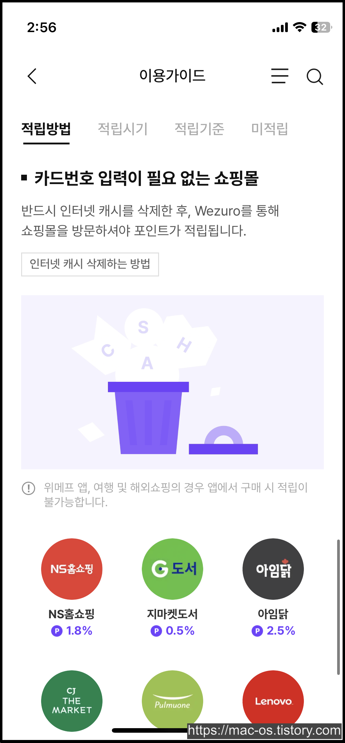 - 카드번호 입력이 없는 쇼핑몰(NS홈쇼핑·지마켓도서·아임닭 등)은 인터넷 캐시를 삭제한 후, 위주로를 통해 쇼핑몰을 방문하면 포인트가 적립된다.