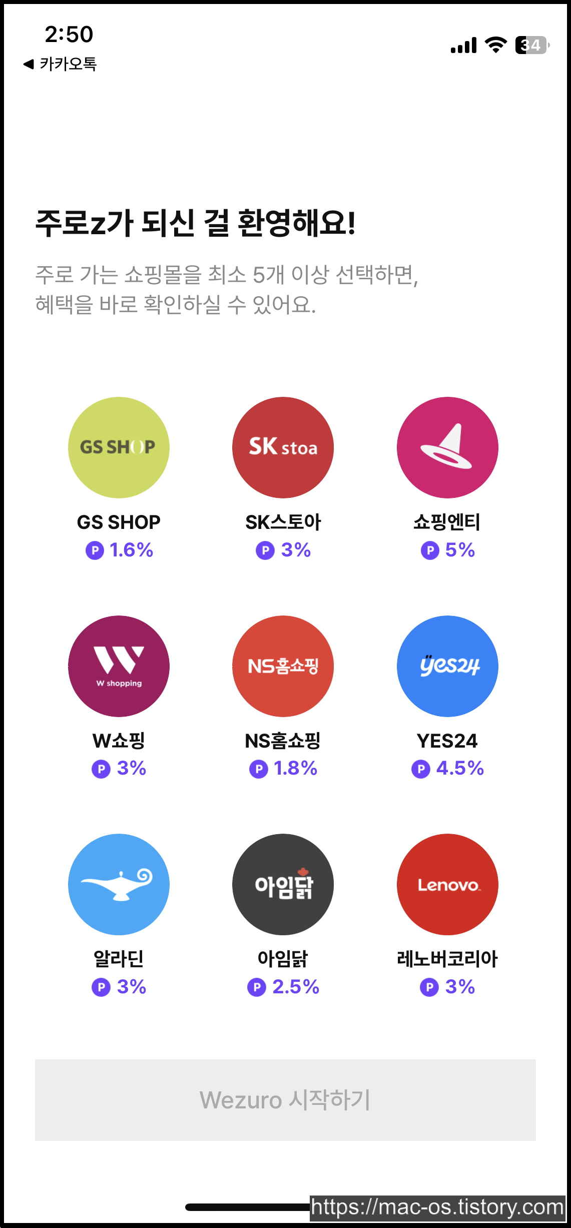 이용약관에 동의하고 주로 가는 쇼핑몰 최소 5개 이상 선택합니다.