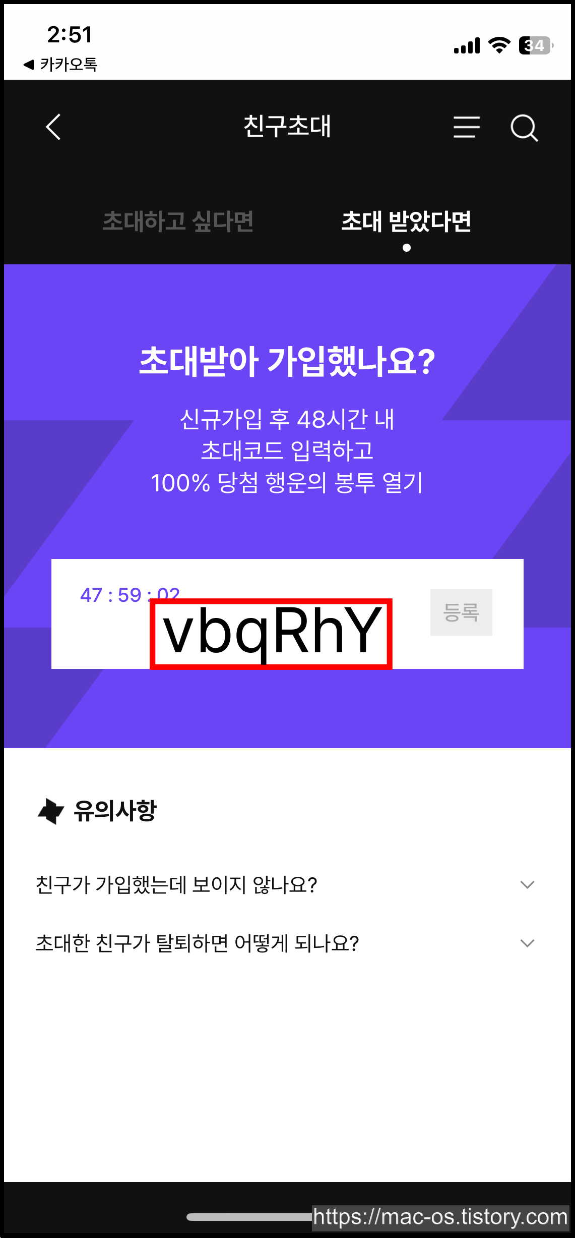 [마이]에서 [친구초대]를 누르고 [초대 받았다면]으로 이동합니다. 그리고 초대코드 입력란에 vbqRhY를 입력합니다.