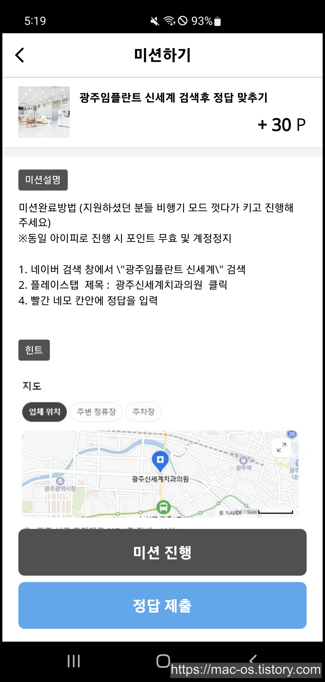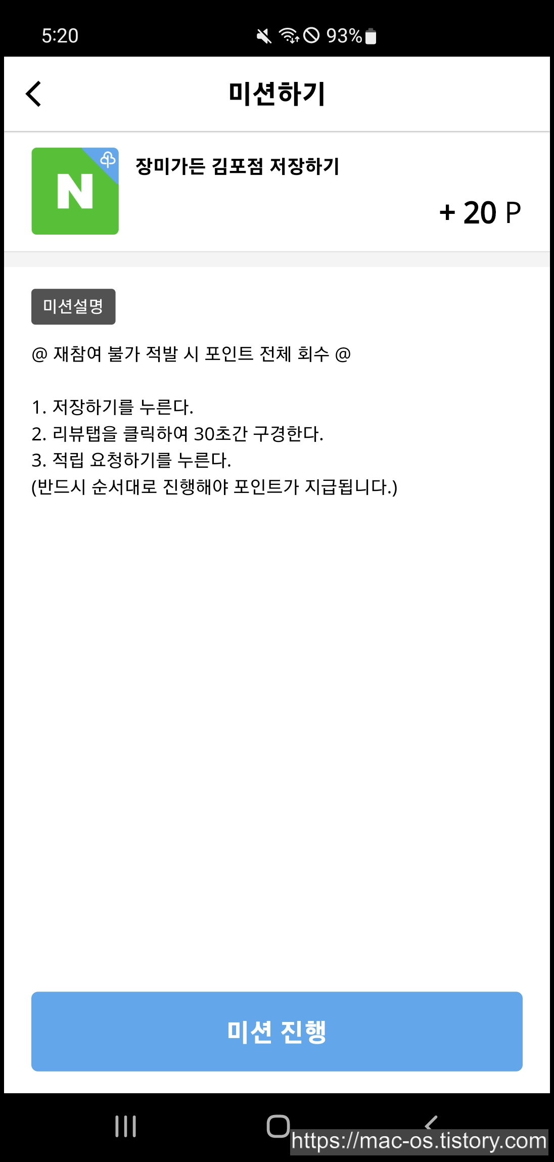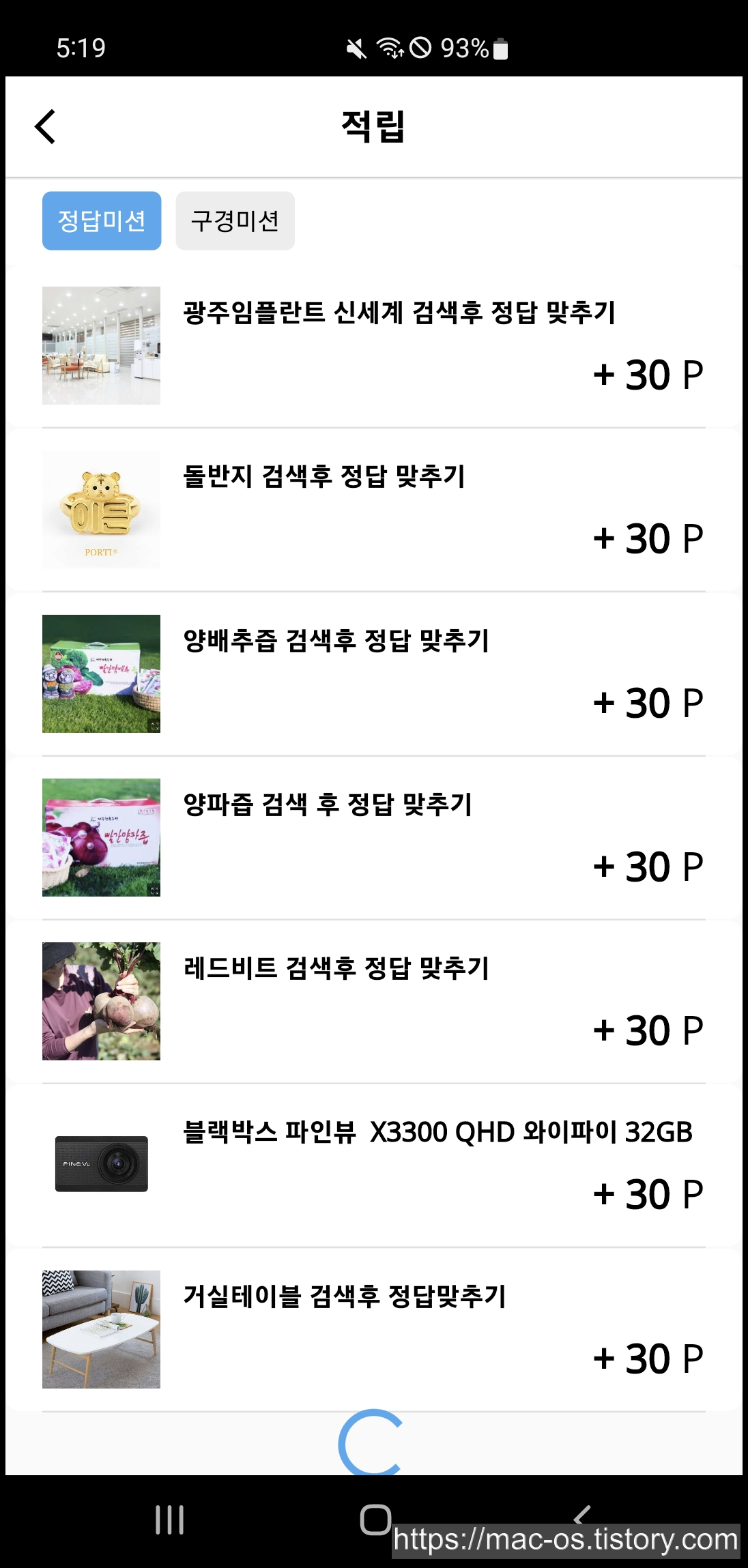 구경 미션은 저장하기를 누르고 리뷰탭을 클릭하여 30초간 구경한다. 그리고 적립 요청하기를 누르면 포인트가 적립되는 식이다.