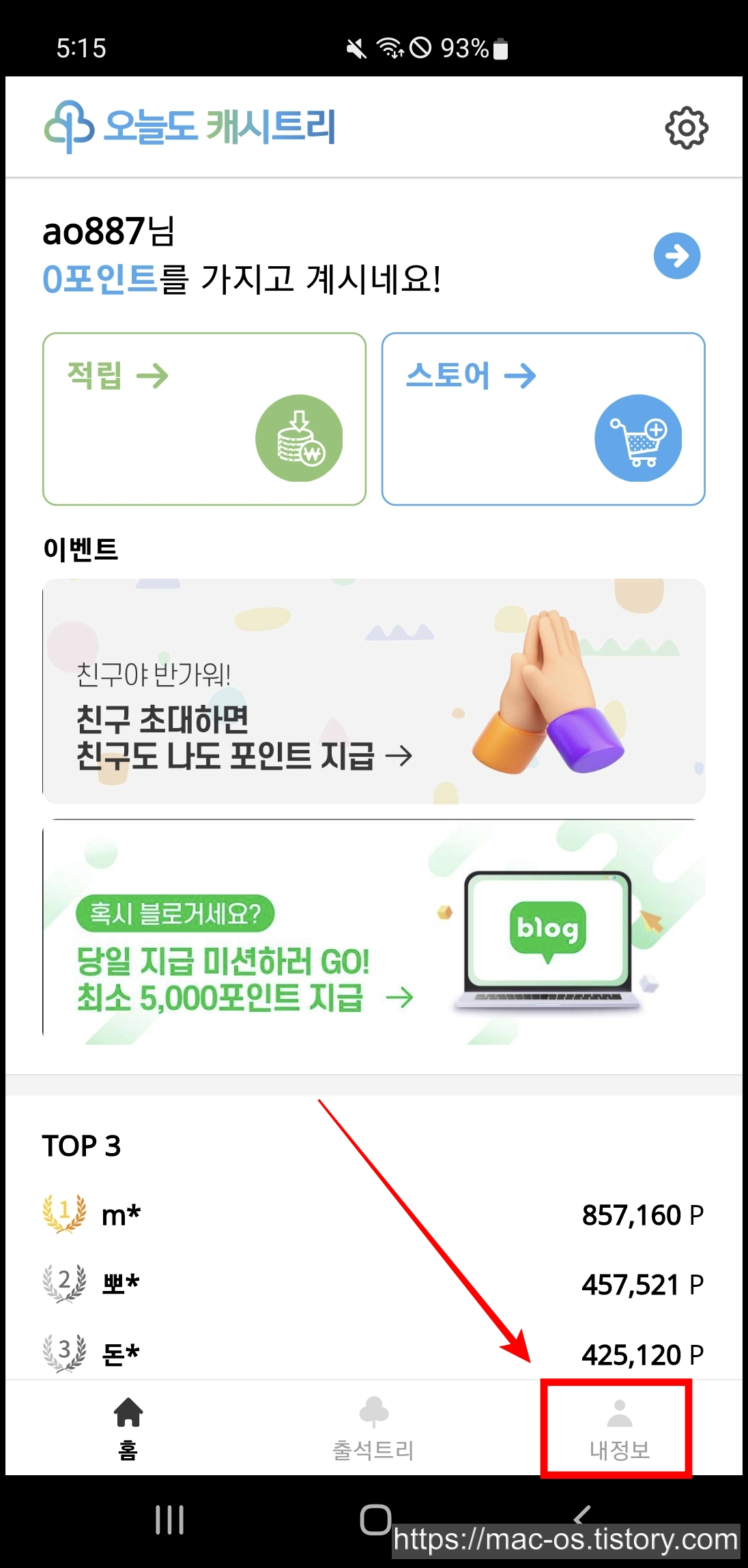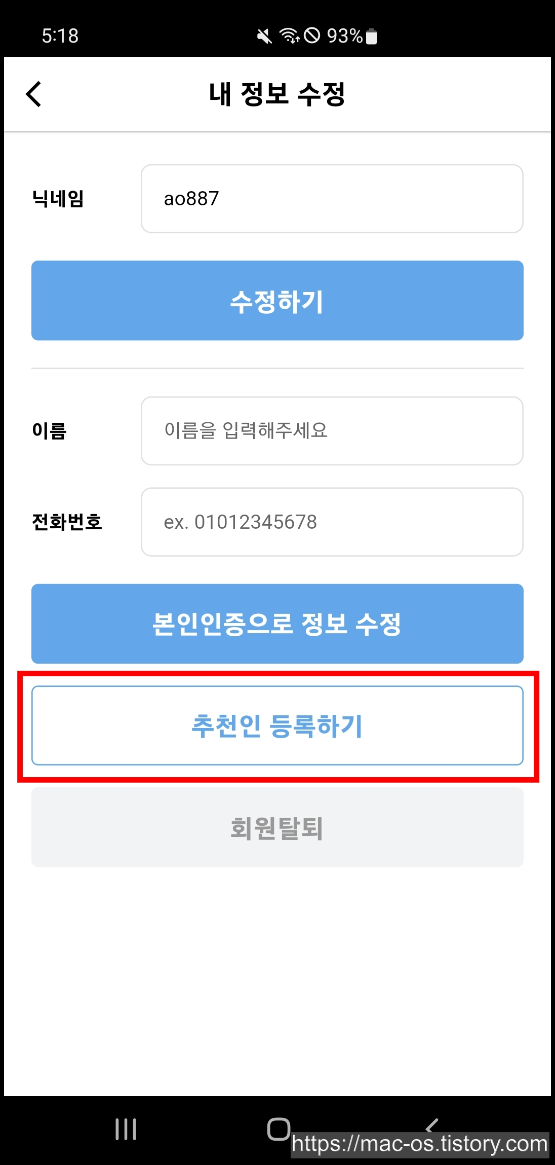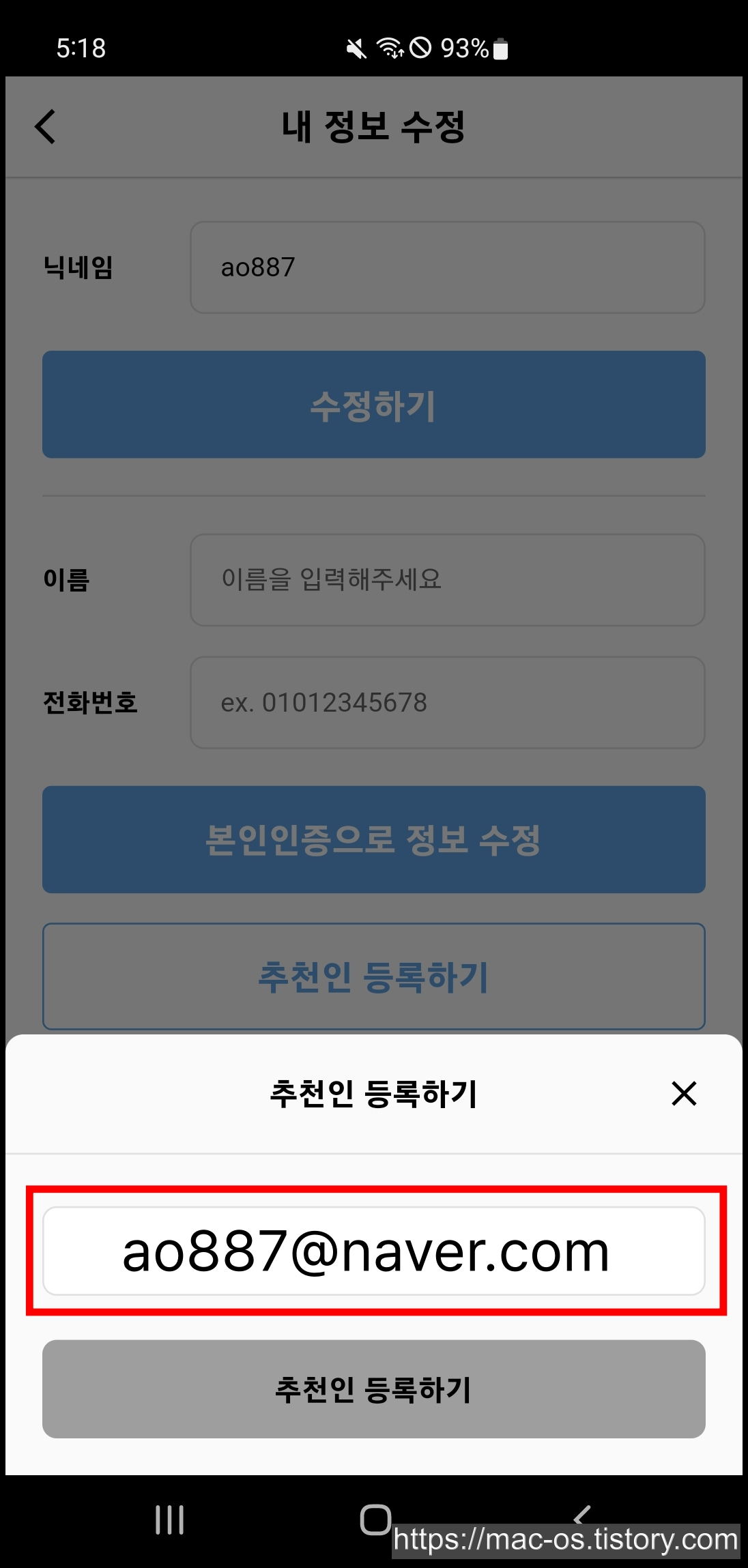 - [내정보]에서 [정보수정]→[추천인 등록하기] 터치