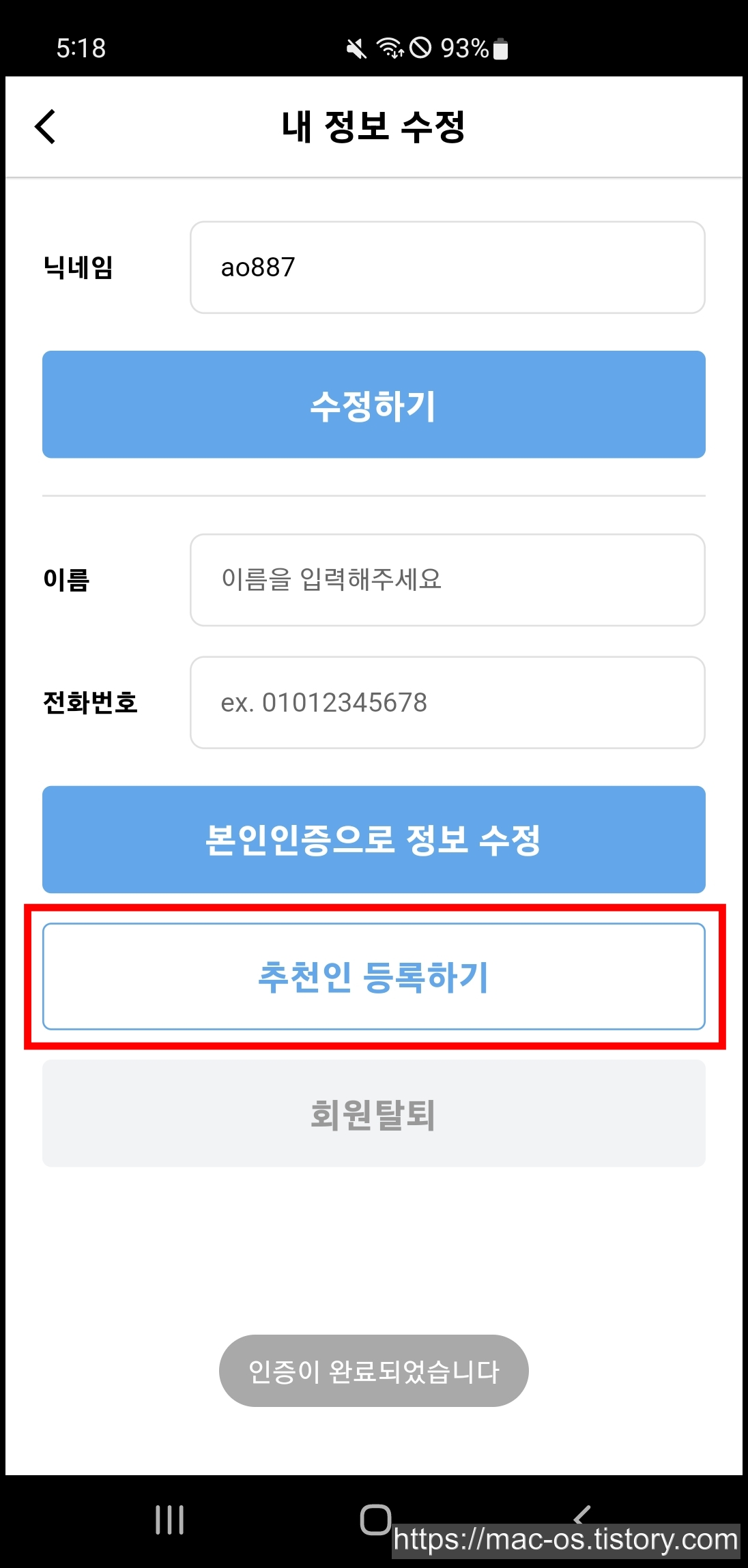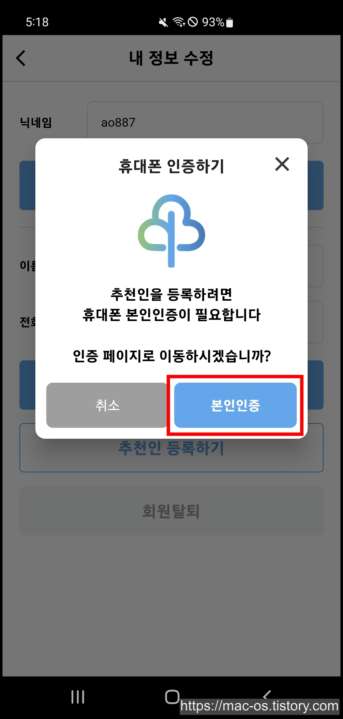 내 정보 수정에서 [추천인 등록하기]를 누르고 본인인증을 진행한다.