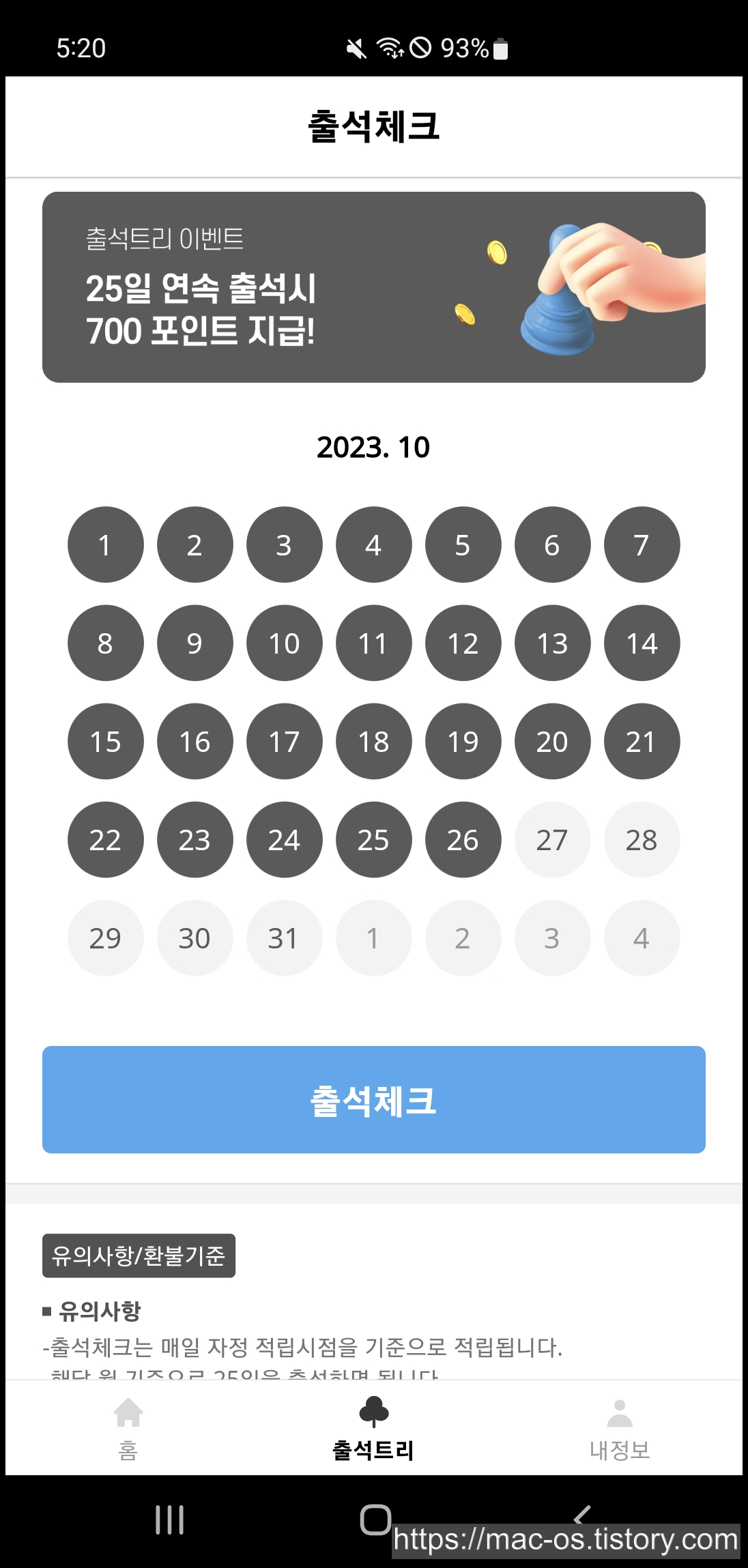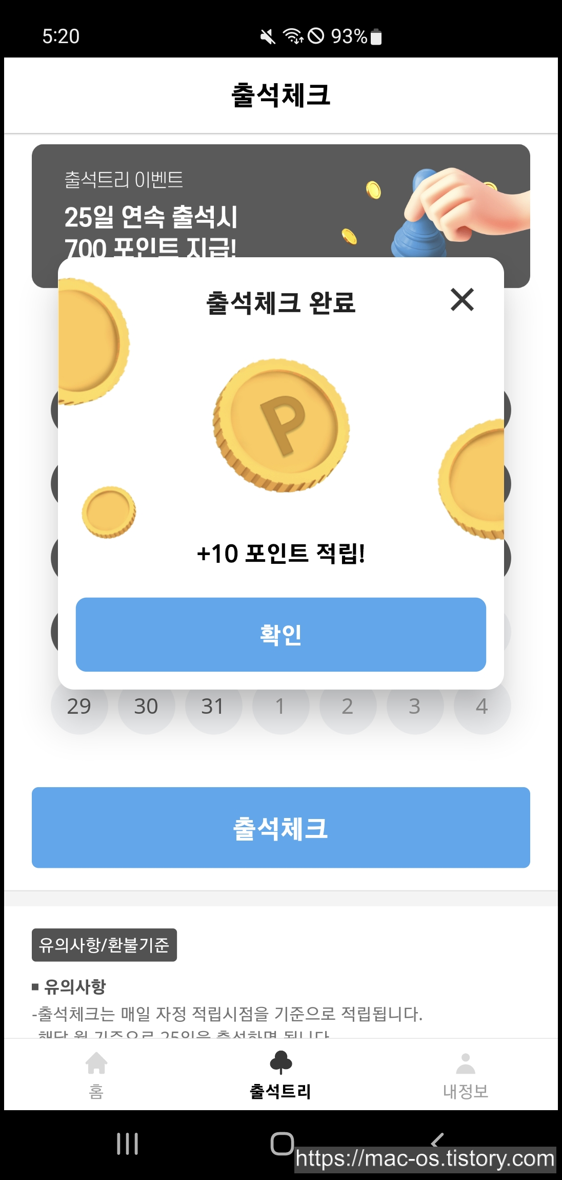 그 외에도 출석체크란 것이 있는데, 하루에 10포인트, 25일 연속 출석하면 700포인트를 준다.