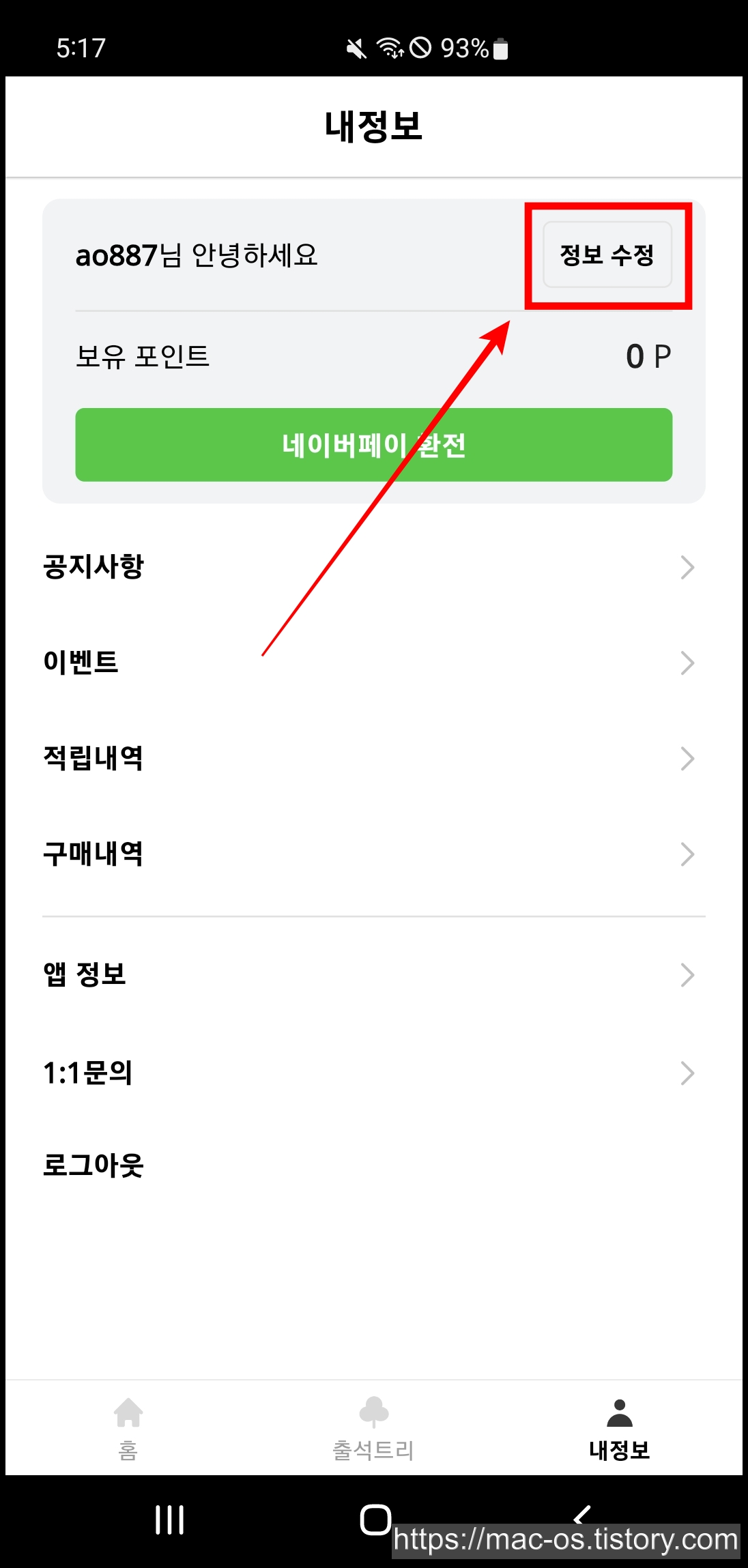회원가입 후 [내정보]→[정보 수정]으로 이동한다.