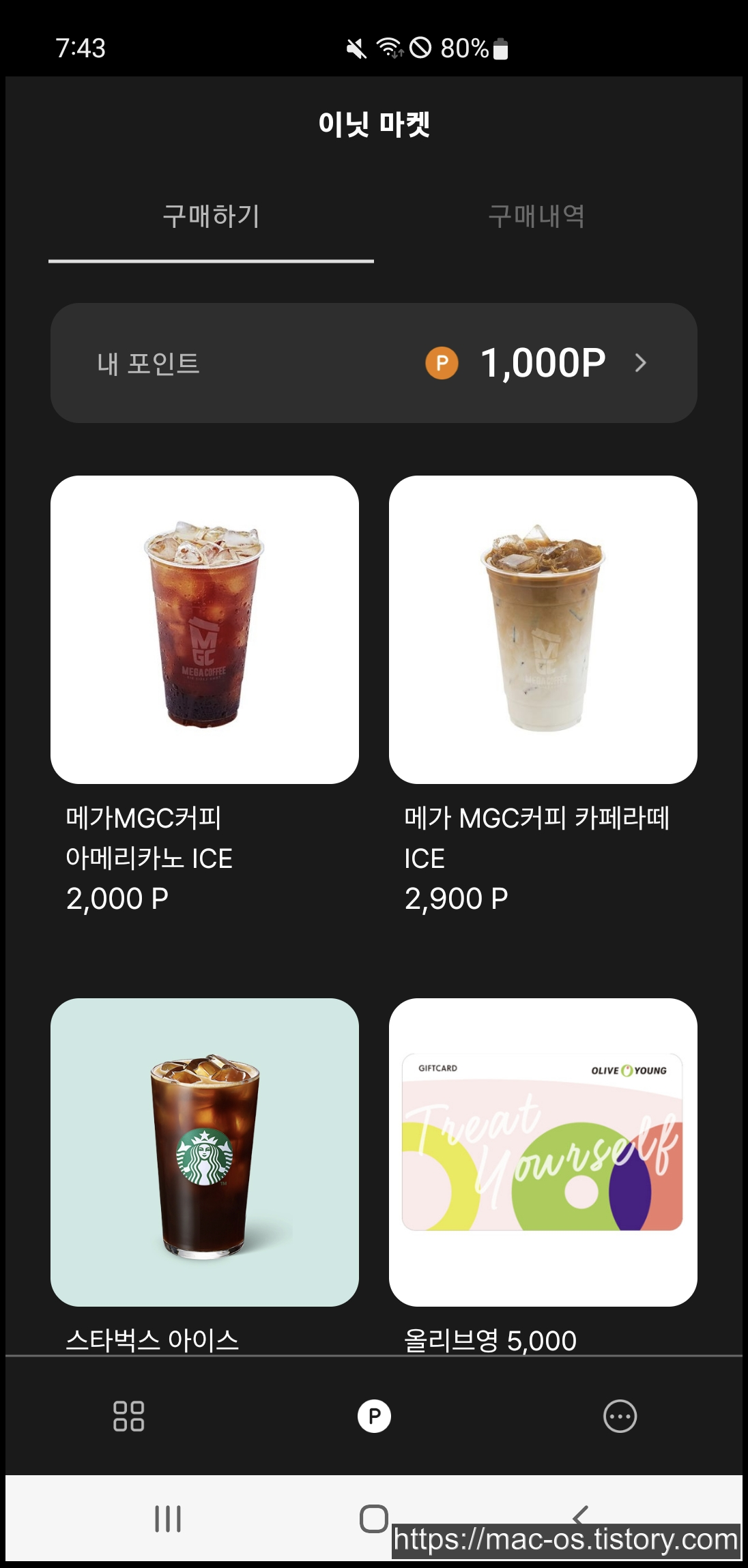 - 미션에 참여하고 얻은 포인트는 이닛 마켓에서 메가커피, 스타벅스, 올리브영, 네이버페이 상품권을 구매하는데 사용할 수 있음