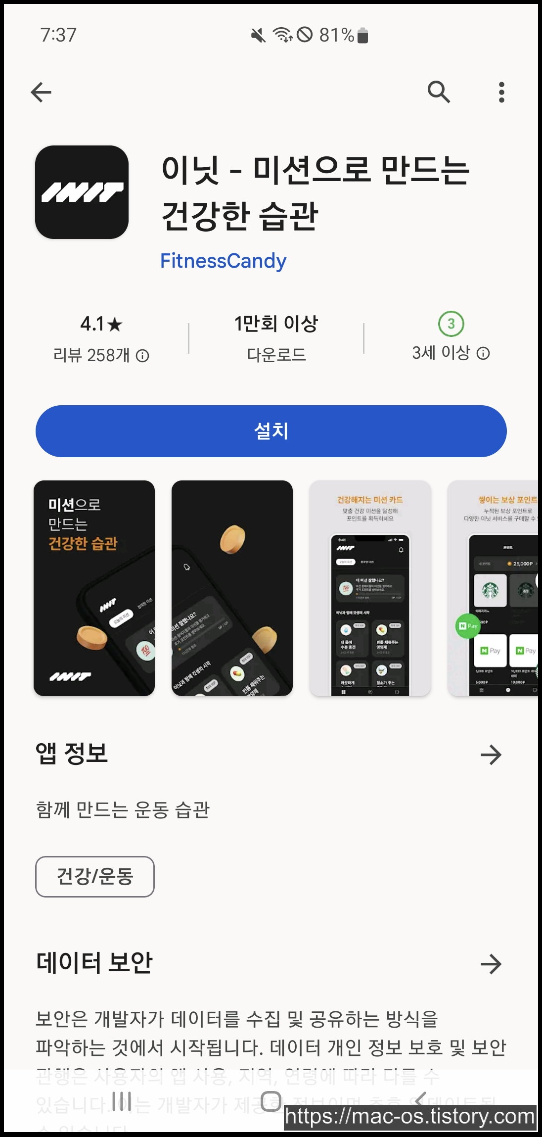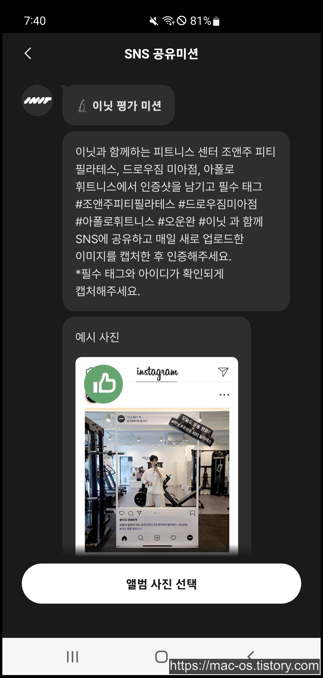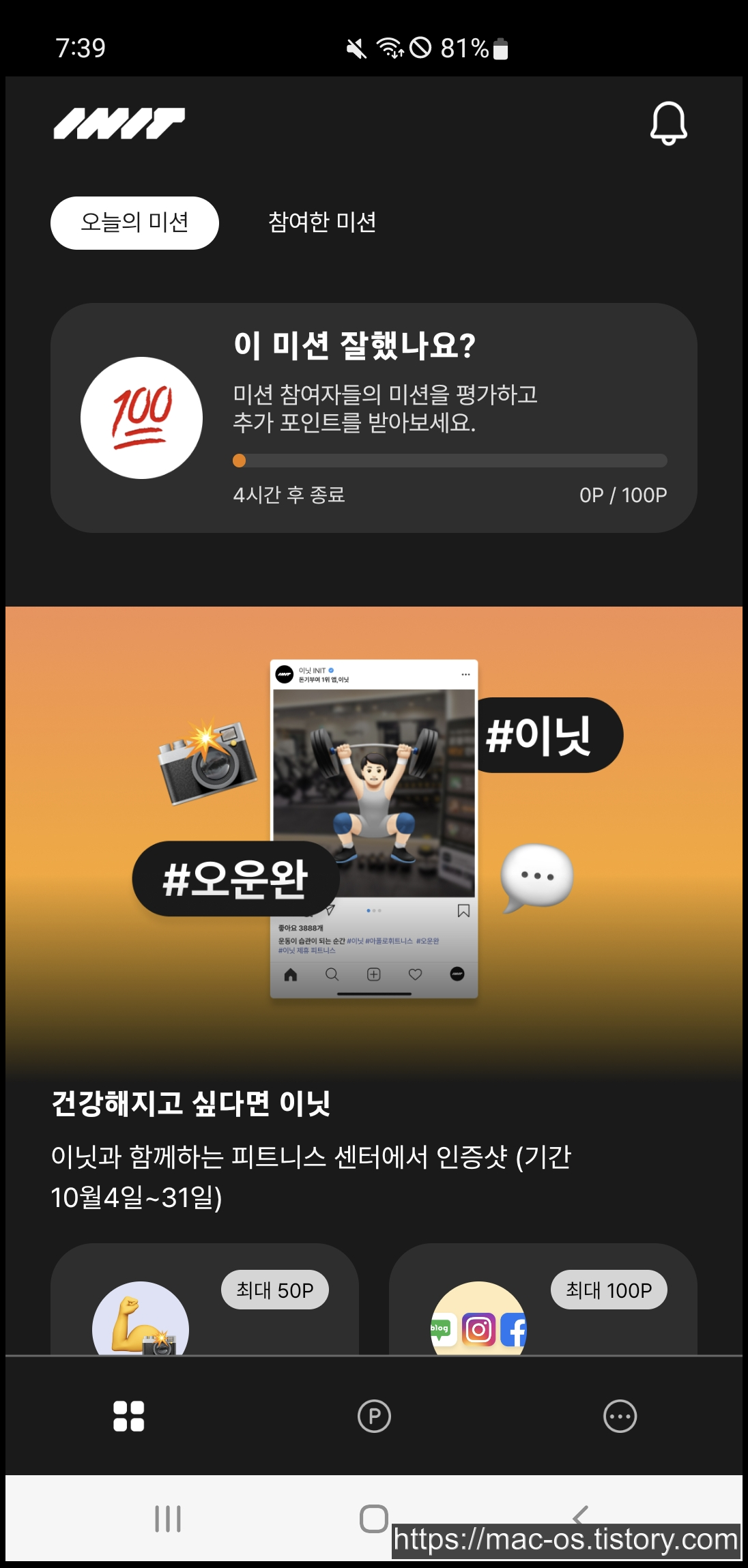 이닛은 오운완 인생샷, SNS 공유미션, 네이버 리뷰 남기기 등 다양한 미션에 참여하고 보상으로 포인트를 얻는 앱입니다.