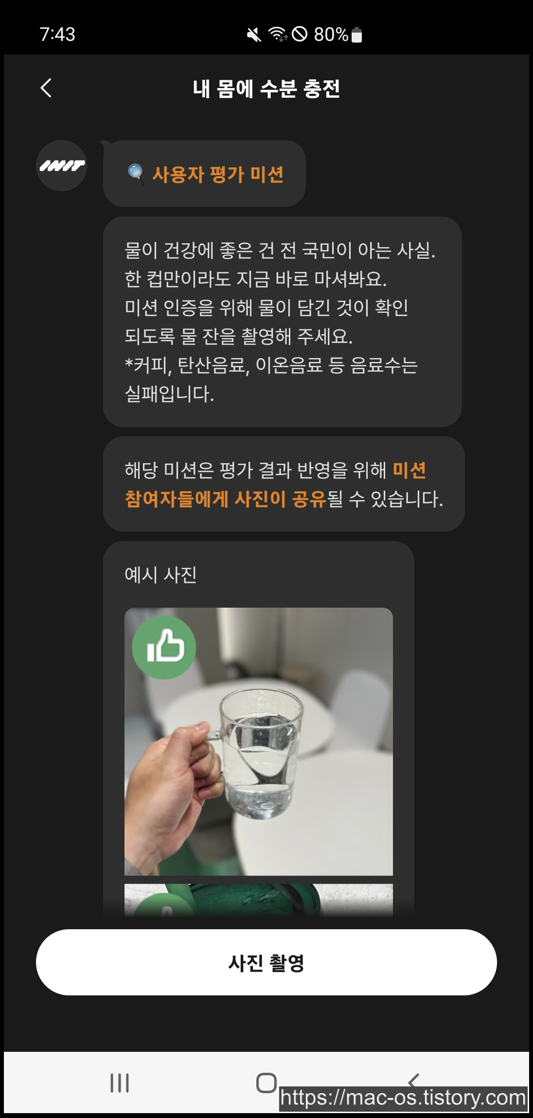- 오운완 인증샷 찍기, 물마시기 인증, 영양제 복용 확인 등 일상생활과 관련된 간단한 미션에 참여하고 보상으로 포인트를 얻음