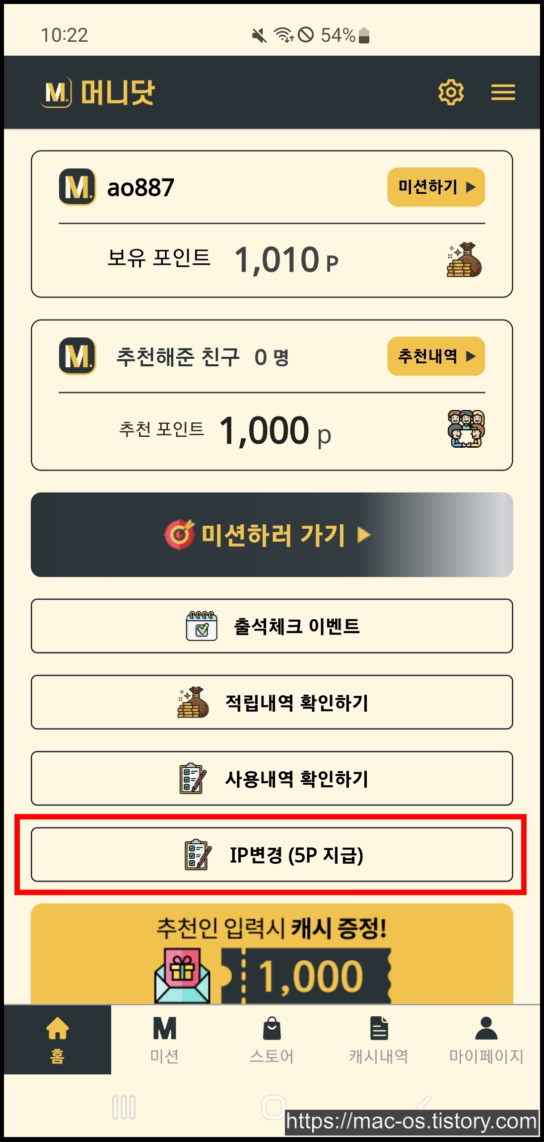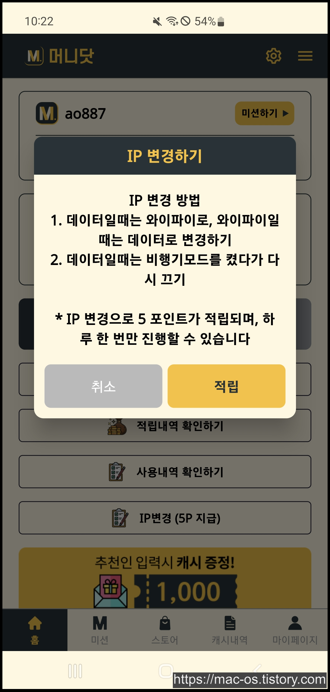 데이터일 때는 와이파이로, 와이파이일 때는 데이터로 변경하여 IP를 변경하면 5포인트가 적립됩니다.