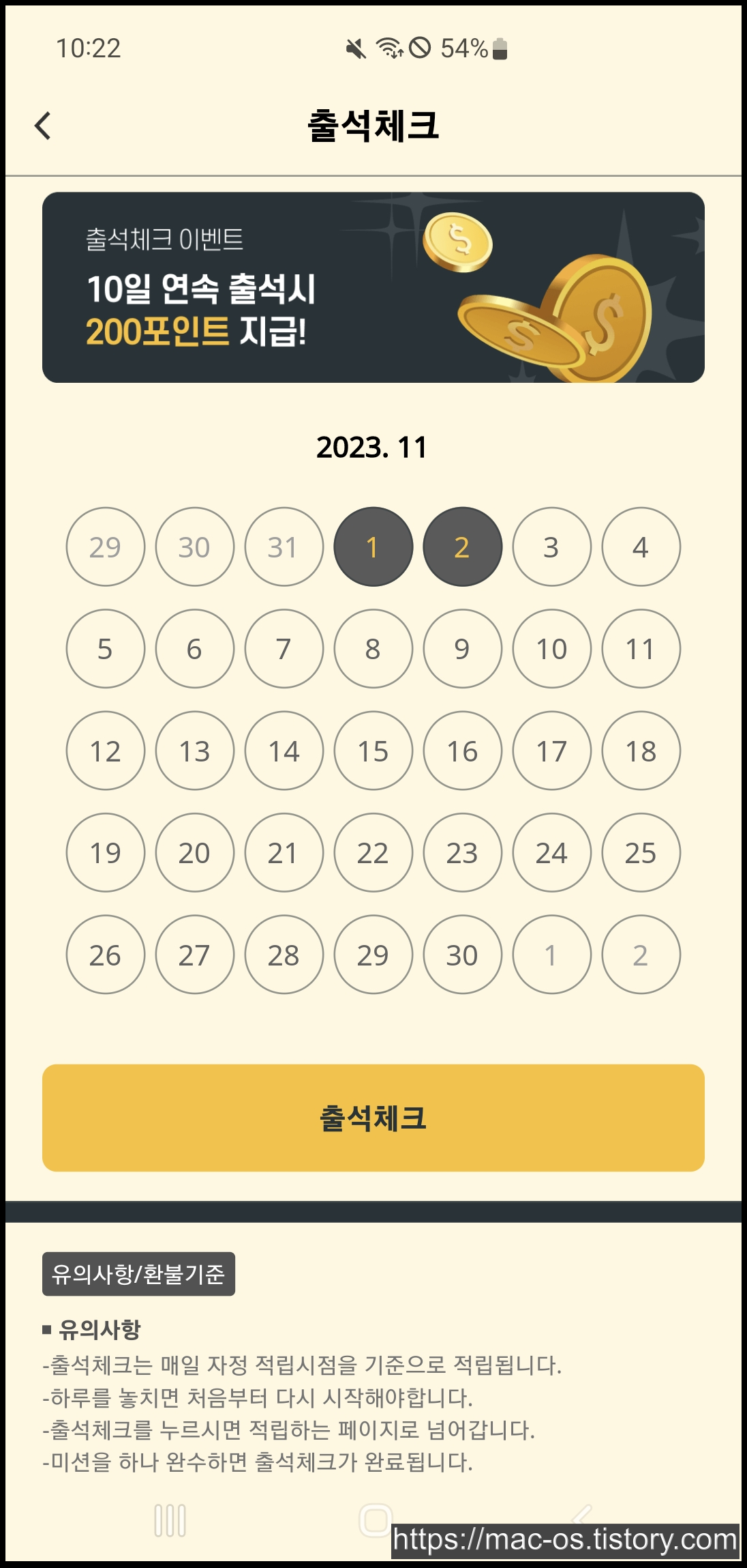 매일 출석체크를 하면 10포인트가 적립됩니다.