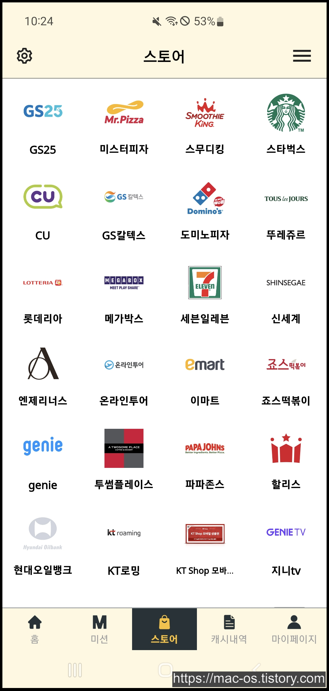 적립한 포인트는 스토어에서 GS25, 미스터피자, 스무디킹, 스타벅스 등의 가게 기프티콘으로 교환하실 수 있습니다.