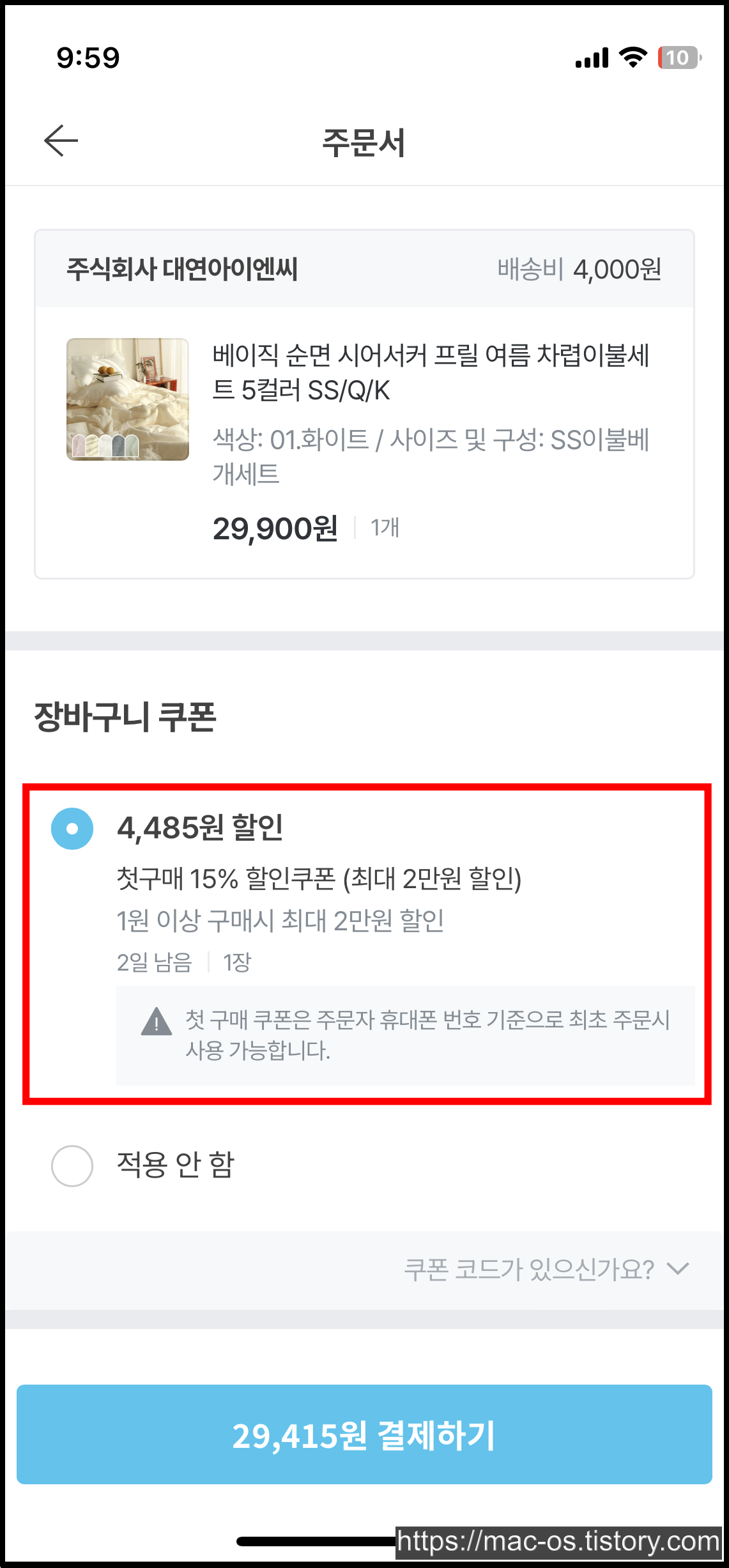 이벤트 페이지에서 아래로 스크롤을 내리면 쿠폰 적용이 가능한 상품을 구경할 수 있다. 오른쪽 사진과 같이 결제 페이지에서 첫구매 15% 할인 쿠폰이 자동으로 적용된다.