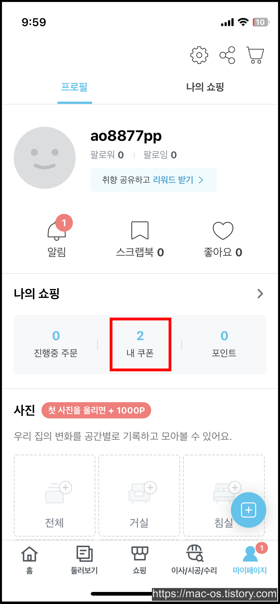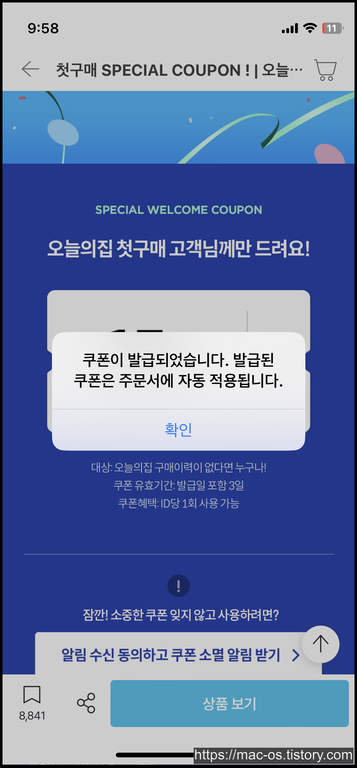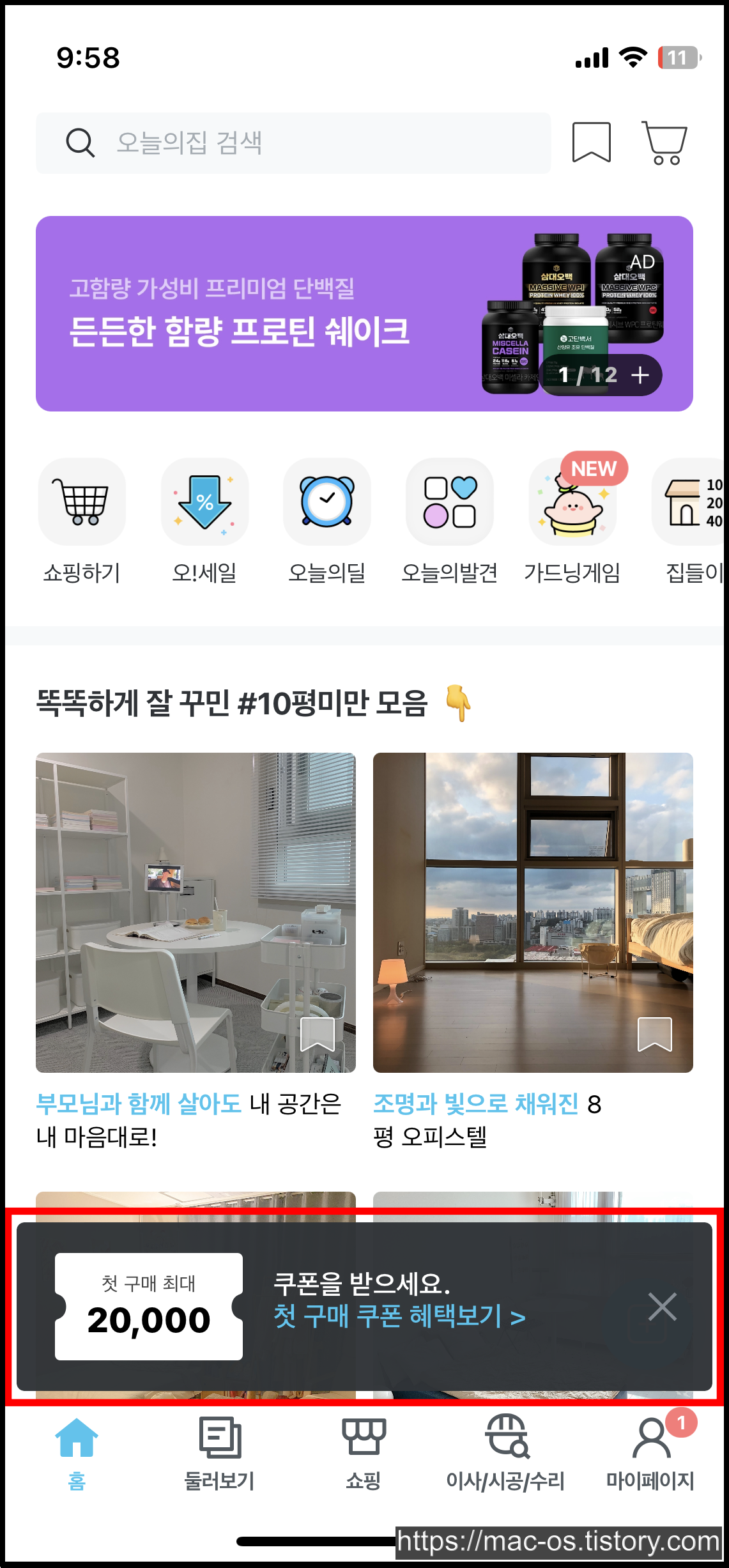 완료를 누르면 오늘의집 회원가입이 끝나는데, 하단에 쿠폰을 받으라는 창을 터치한다.