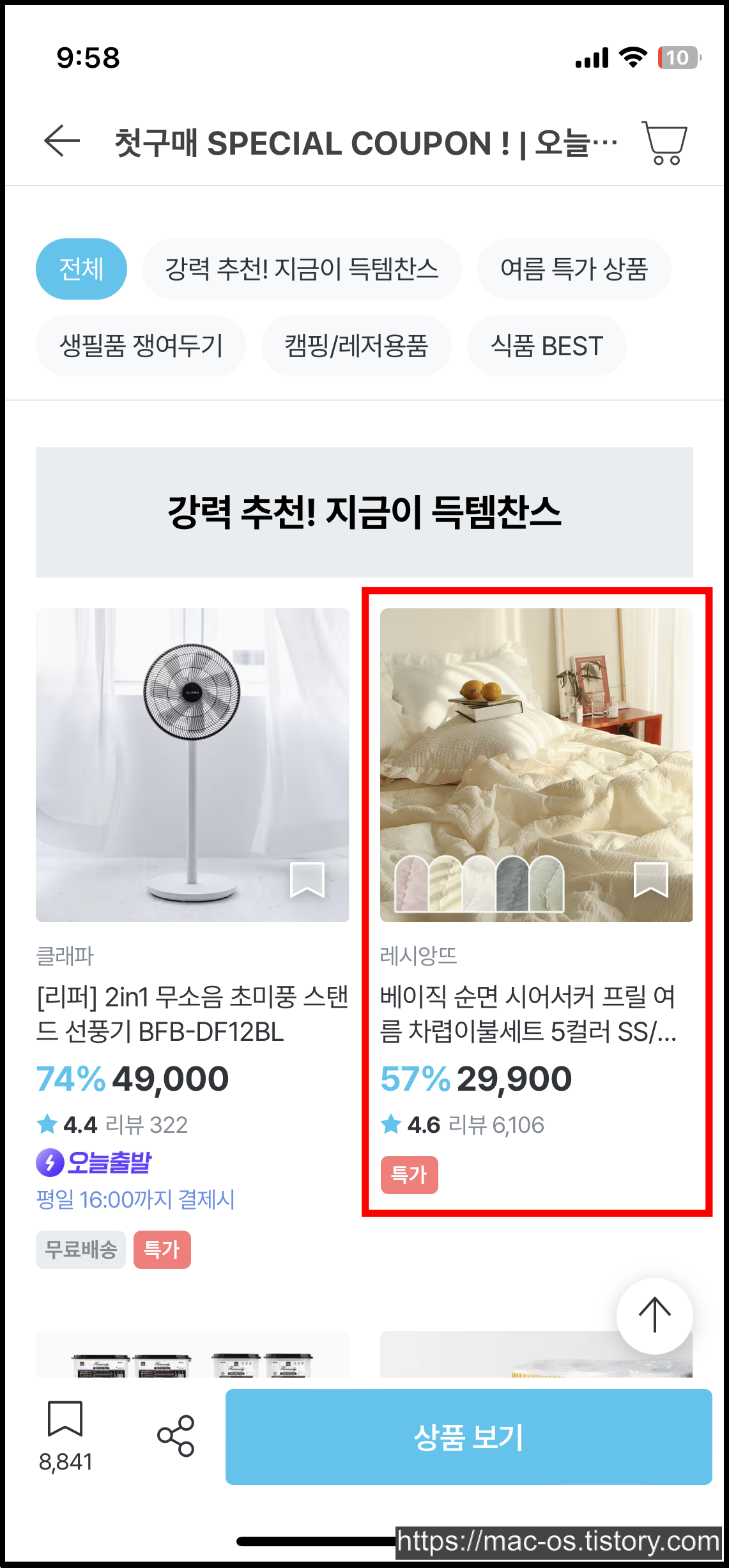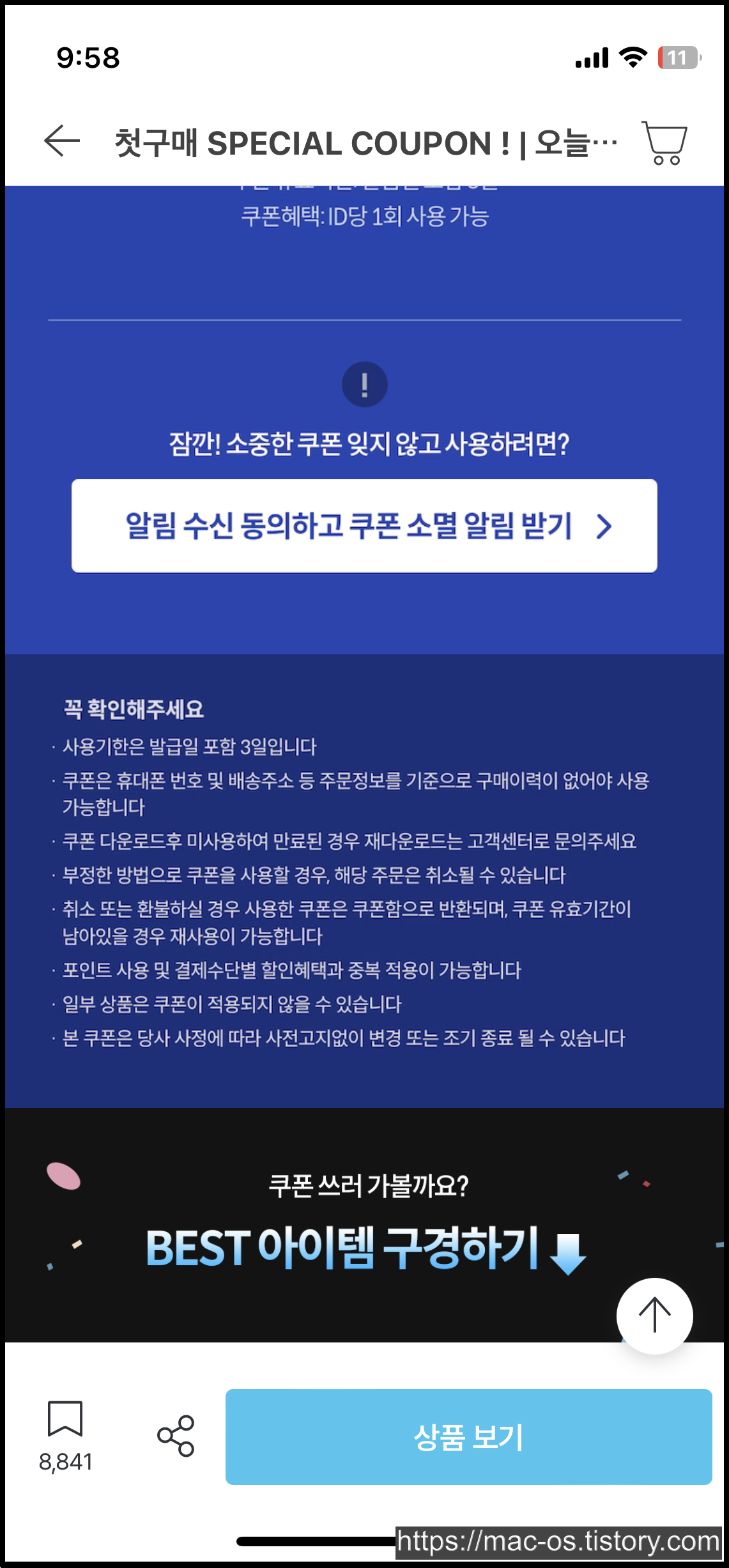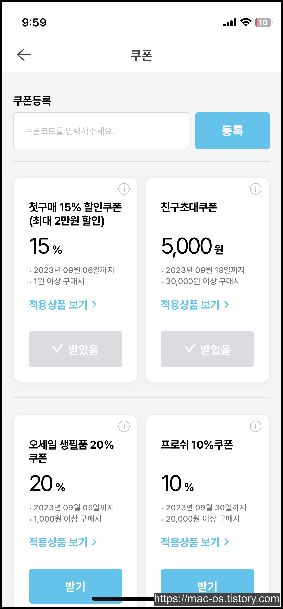 완료를 누르면 오늘의집 회원가입이 끝나는데, 하단에 쿠폰을 받으라는 창을 터치한다.