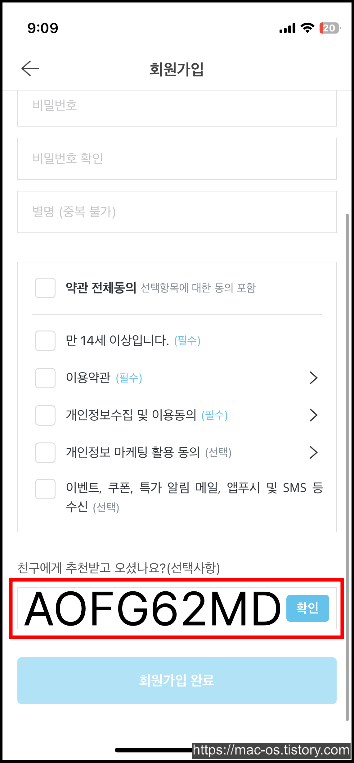 - 회원가입 페이지에서 추천코드 입력하고 가입