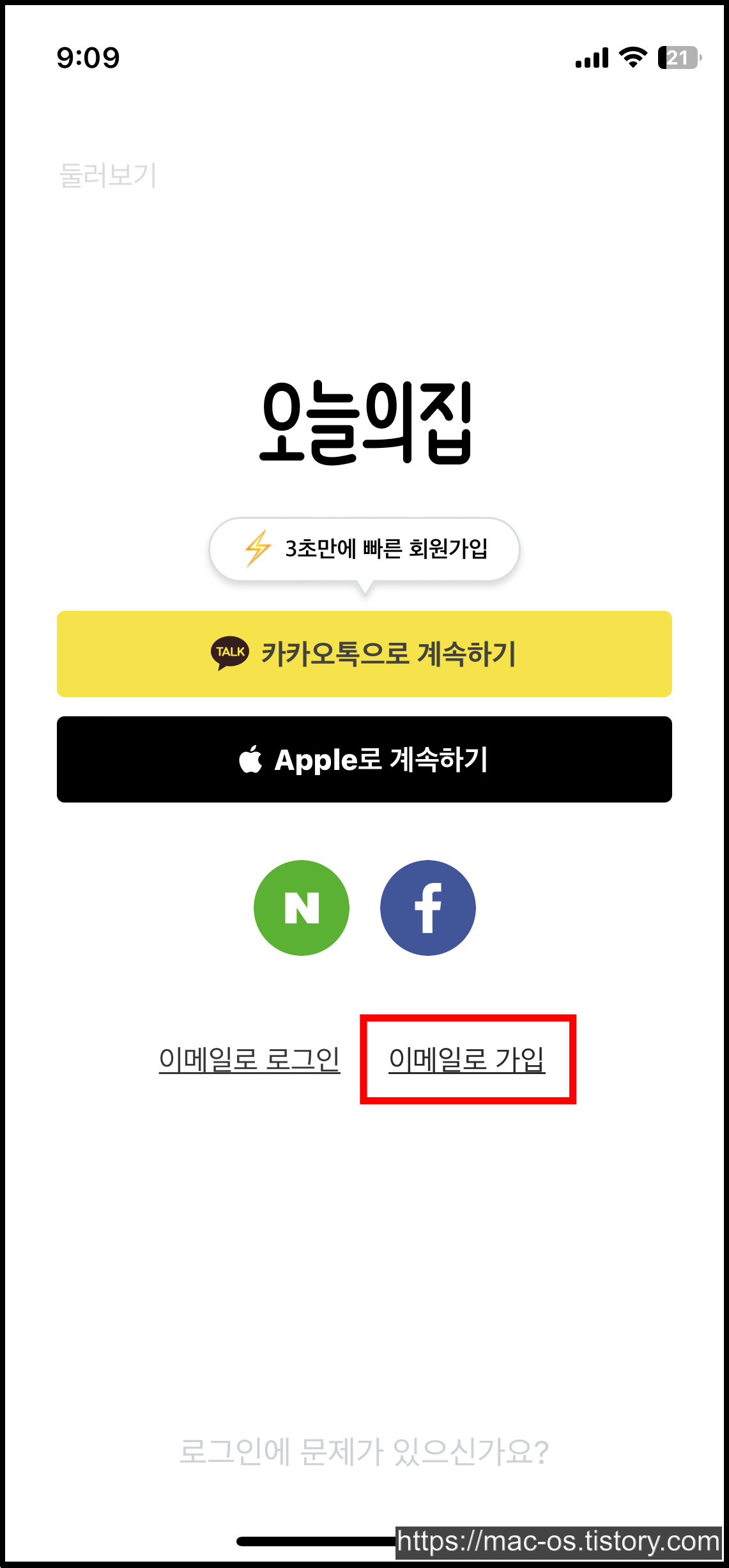 오늘의집은 구글 플레이 스토어와 애플 앱스토어에서 설치할 수 있다. 앱을 실행한 다음 카카오톡, 애플, 네이버, 페이스북으로 로그인하거나 이메일로 가입을 진행한다.