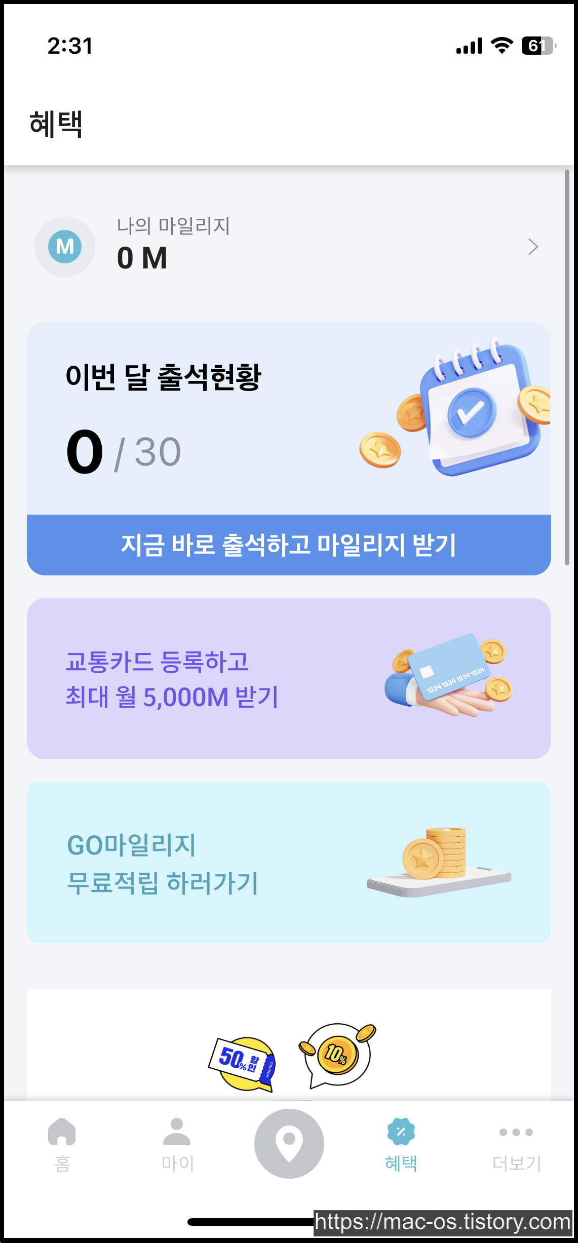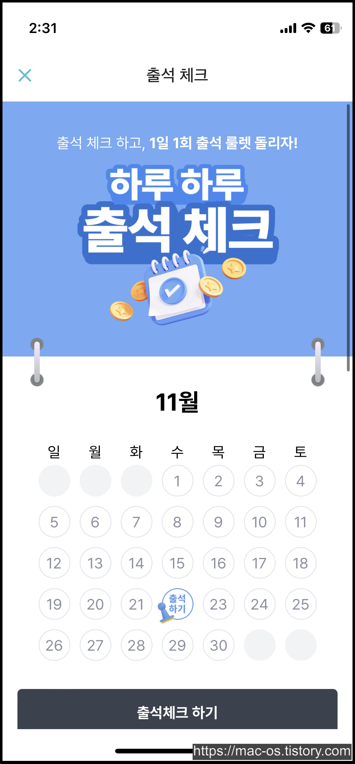 혜택 메뉴로 이동하면 출석체크가 있는데요.